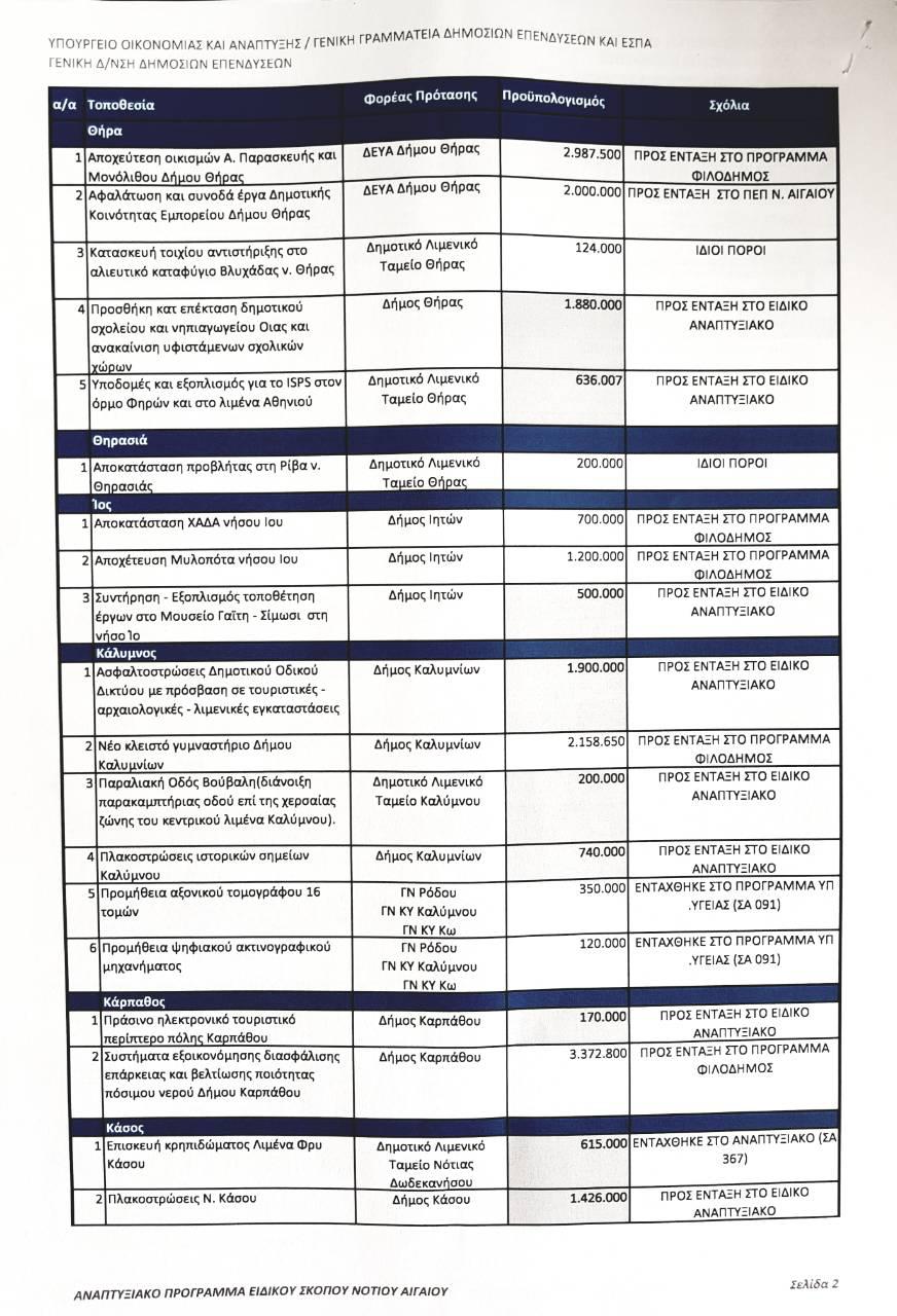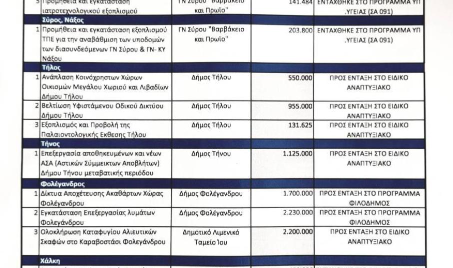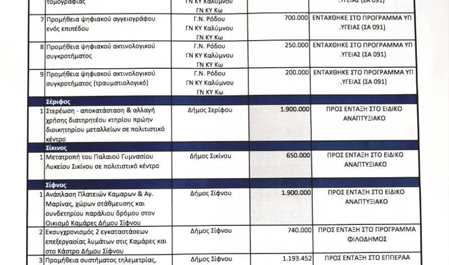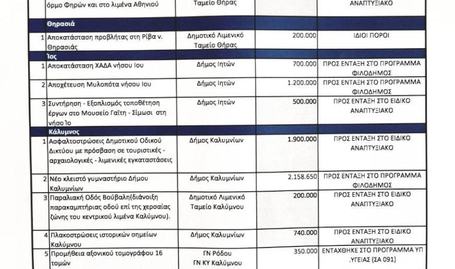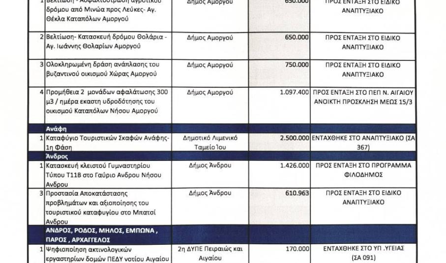 Ειδικότερα, στο ενισχυμένο κατά 58 εκατ. €, Ειδικό Αναπτυξιακό Πρόγραμμα Νοτίου Αιγαίου, εντάσσονται 57 έργα ενώ άλλα 47 έργα εντάσσονται σε άλλα προγράμματα (πχ πρόγραμμα Φιλόδημος του Υπουργείου Εσωτερικών), προϋπολογισμού 55 εκατ. ευρώ.
