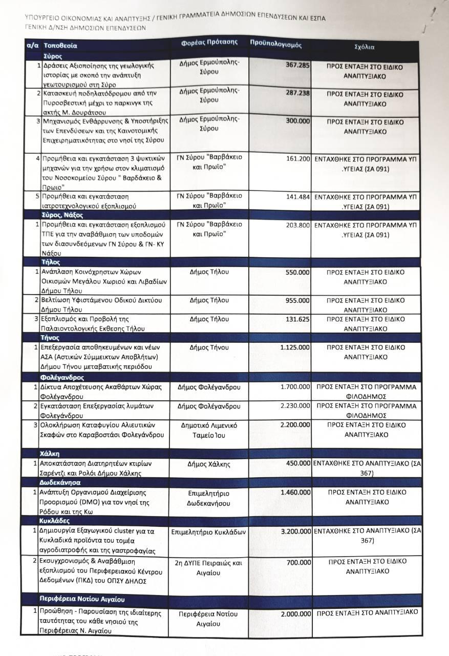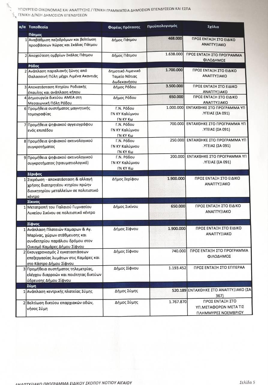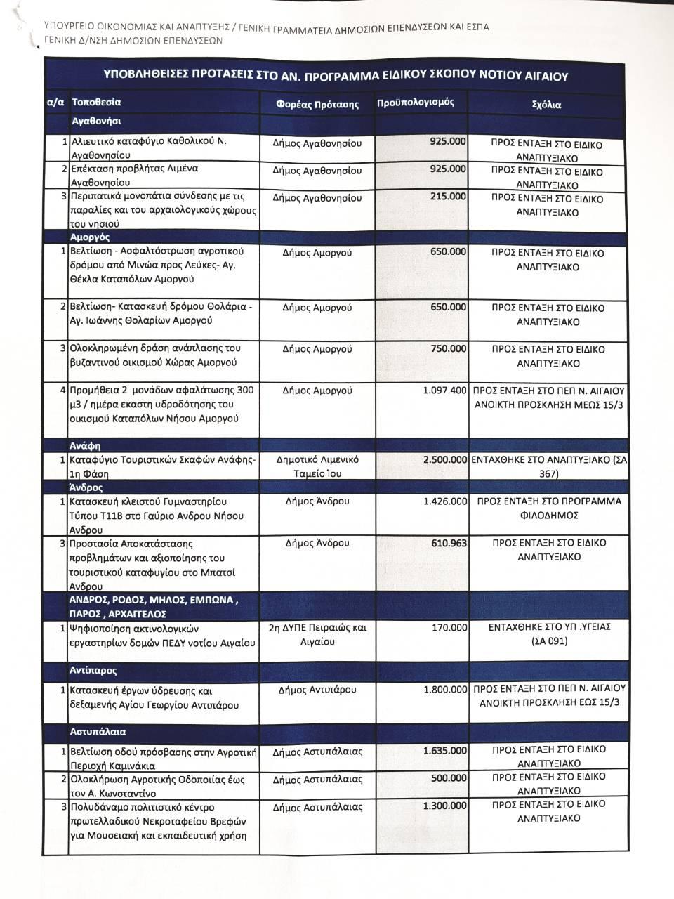 Ειδικότερα, στο ενισχυμένο κατά 58 εκατ. €, Ειδικό Αναπτυξιακό Πρόγραμμα Νοτίου Αιγαίου, εντάσσονται 57 έργα ενώ άλλα 47 έργα εντάσσονται σε άλλα προγράμματα (πχ πρόγραμμα Φιλόδημος του Υπουργείου Εσωτερικών), προϋπολογισμού 55 εκατ. ευρώ.