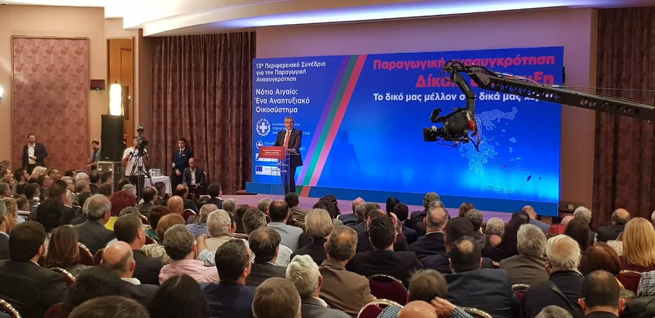 Παρόντος του πρωθυπουργού, μεγάλου αριθμού υπουργών, υφυπουργών και γενικών γραμματέων των υπουργείων που συμμετείχαν στις 8 παράλληλες θεματικές συνεδρίες του διήμερου συνεδρίου, παρόντων των εκπροσώπων της αυτοδιοίκησης, των τοπικών αρχών και φορέων και κόσμου, ο Περιφερειάρχης κάλεσε την κυβέρνηση να εμπιστευτεί τις δυνατότητες του Νοτίου Αιγαίου, μιας περιοχής που δεν δίστασε να βάλει πλάτη στη χώρα, στις δύσκολες στιγμές της και που θα το ξανακάνει αν χρειαστεί, με «αντάλλαγμα» την υποστήριξη των νησιών του στην προσπάθεια αξιοποίησης των ευκαιριών και των δυνατοτήτων που έχει και που μέχρι σήμερα παραμένουν αναξιοποίητες, με σοβαρές επιπτώσεις όχι μόνο για το Νότιο Αιγαίο αυτό καθ΄αυτό, αλλά και για τη χώρα συνολικά, που στερείται σημαντικό ποσοστό του ΑΕΠ και θέσεων εργασίας.
