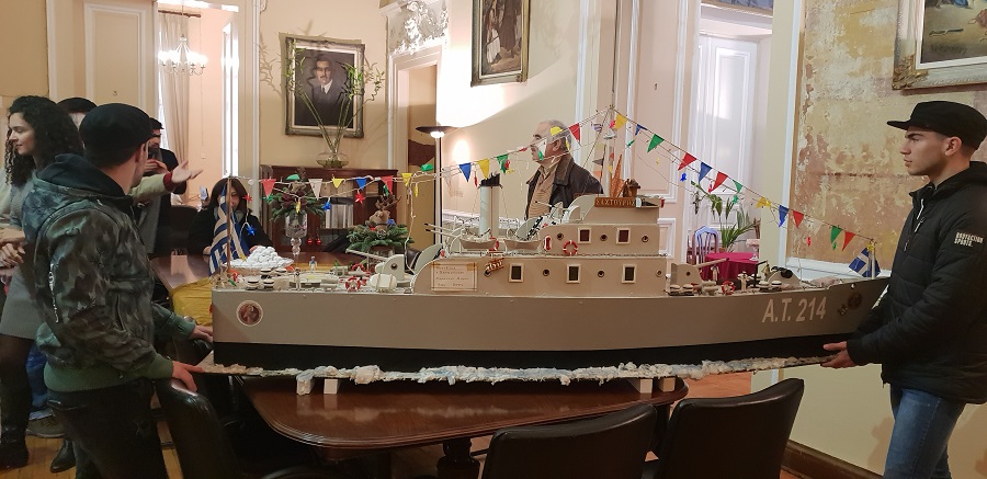 Με τοπικές ενδυμασίες και συνοδεία παραδοσιακών μουσικών οργάνων, τα μέλη του Λυκείου Ελληνίδων Σύρου και του «Αρώματος Παράδοσης», κρατώντας το πατροπαράδοτο Καραβάκι, έψαλαν τα συριανά - και όχι μόνο - κάλαντα στον κ. Λεονταρίτη, ενώ ταυτόχρονα του ευχήθηκαν για την νέα χρονιά.