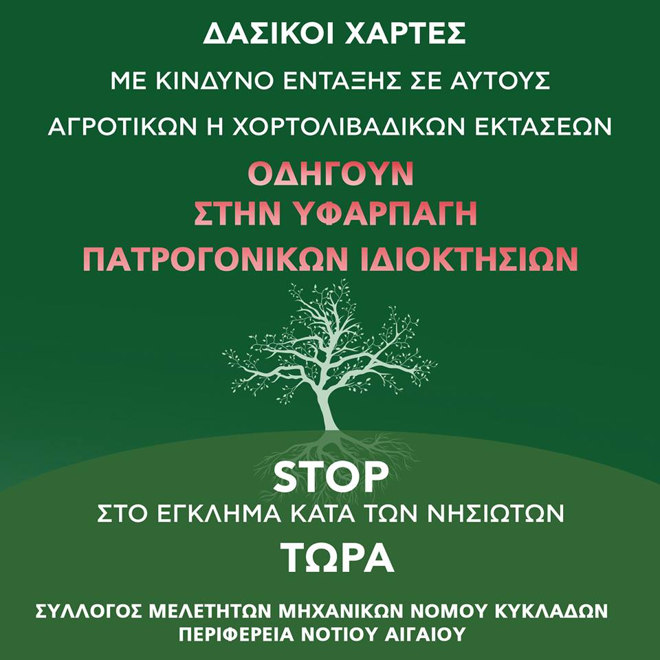 Υπενθυμίζεται ότι ο Περιφερειάρχης Νοτίου Αιγαίου, έχει αποστείλει επιστολές σε όλους τους δημάρχους του Νοτίου Αιγαίου, να εκφράσουν την κάθετη αντίθεσή τους στους κυβερνητικούς σχεδιασμούς περί δασικών χαρτών, με την έκδοση ψηφισμάτων από τα κατά τόπους δημοτικά συμβούλια, παράλληλα με την σύσταση ενός κοινού και αρραγούς μετώπου, που μαζί με τους επιστημονικούς, κοινωνικούς και παραγωγικούς φορείς, θα κινηθούν σε ενιαία γραμμή πλεύσης, προκειμένου να αποτρέψουν την υφαρπαγή της πατρογονικής περιουσίας των νησιωτών.