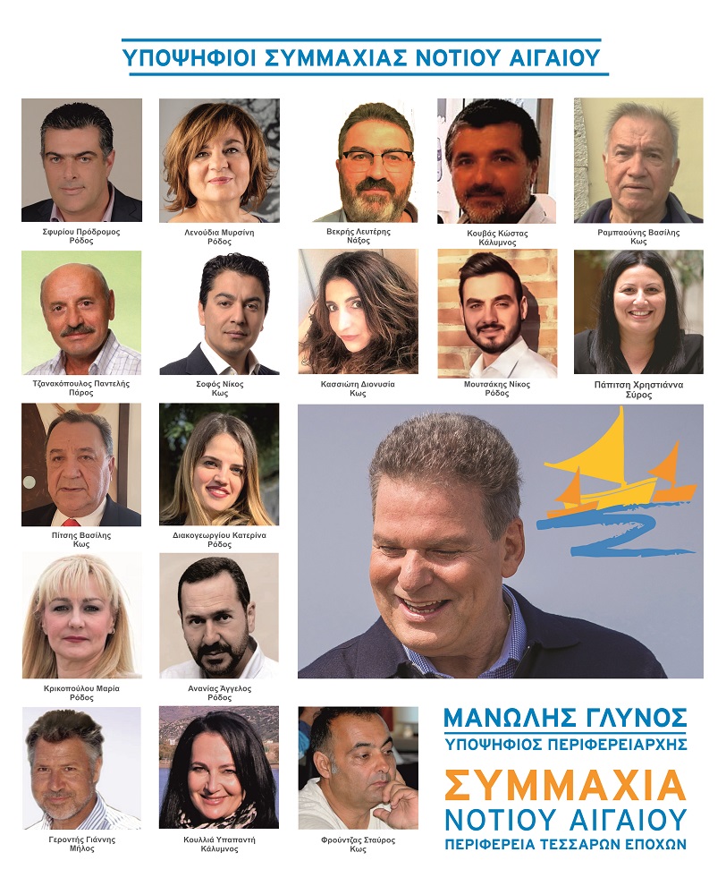 Μαζί με τους ήδη 21 ανακοινωθέντες διαμορφώνουν τις κοινωνικές και πολιτικές συνθήκες για να φουσκώσουν ακόμα περισσότερο τα πανιά της Συμμαχίας Νοτίου Αιγαίου. Τα πανιά της παράταξης μας με επικεφαλής τον Μανώλη Γλυνό και πυξίδα ένα μέλλον ευημερίας για όλους τους νησιώτες και τα παιδιά μας.