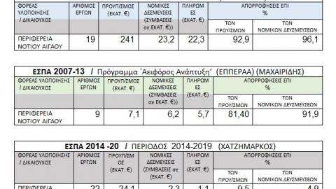 Σ΄ ότι αφορά τον πρωταθλητισμό πληρωμών και επιδόσεων στο ΕΣΠΑ 2014-20 που ισχυρίζεται η περιφερειακή αρχή, εννοεί τα έργα που υλοποίησαν και υλοποιούν οι έτεροι δικαιούχοι φορείς του Νοτίου Αιγαίου ήτοι Δήμοι, ΔΕΥΑ, Λιμενικά Ταμεία, Υπουργεία, Δημόσιοι Φορείς κλπ.