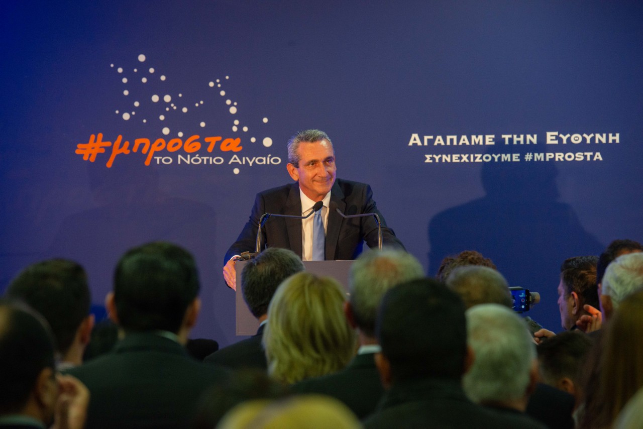 Αγαπάμε την ευθύνη, συνεχίζουμε μπροστά. Δεν θα επιτρέψω ποτέ, όσο ο Θεός με έχει καλά, ο τόπος μας να γυρίσει στο πιο γκρίζο, σκοτεινό, φαύλο παρελθόν του. Δεν γυρίζει πίσω το Νότιο Αιγαίο. Μόνο Μπροστά. Αγαπάμε την ευθύνη, αγαπάμε τα νησιά μας!”