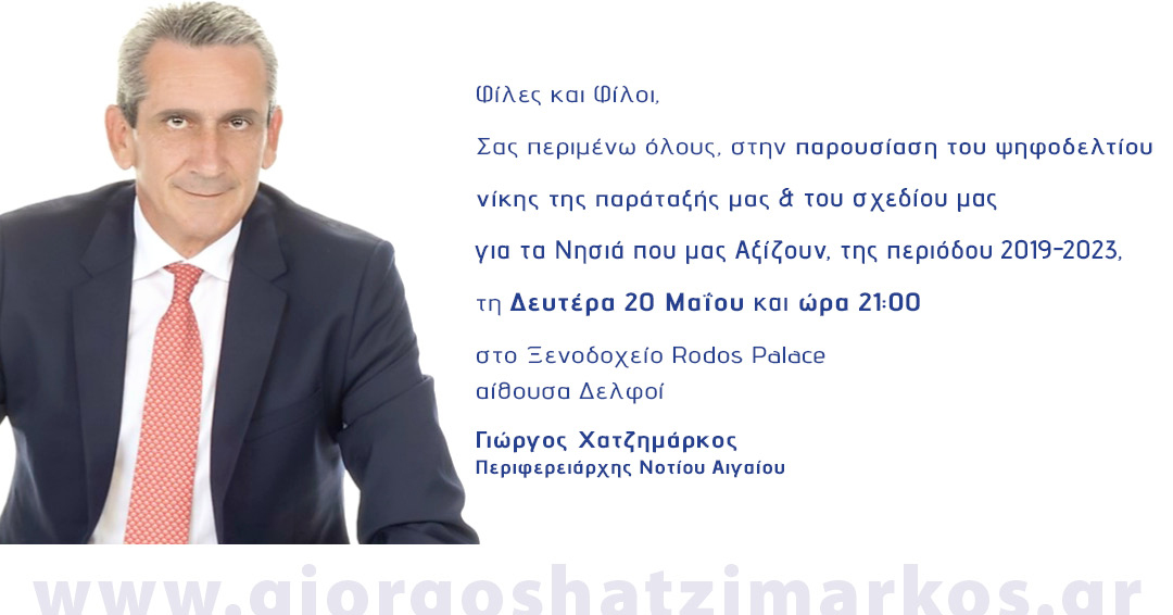 Στην κεντρική του ομιλία, που θα πραγματοποιηθεί στη Ρόδο και κατά την οποία θα παρουσιάσει το ψηφοδέλτιο και θα αναλύσει το σχέδιο του συνδυασμού του "Μπροστά το Νότιο Αιγαίο" για τα νησιά, με φόντο την επόμενη τετραετία, προσκαλεί ο Γιώργος Χατζημάρκος.