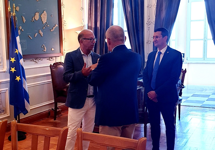 Εθιμοτυπική συνάντηση με τον Πρέσβη της Ιταλίας στην Ελλάδα κ. Luigi Marras, o οποίος συνοδευόταν από τον Υπεύθυνο Ασφαλείας της Ιταλικής Πρεσβείας κ. Silvio Cabiddu, είχε σήμερα το μεσημέρι στο γραφείο του στη Σύρο ο Αντιπεριφερειάρχης Κυκλάδων κ. Γιώργος Λεονταρίτης, κατόπιν σχετικού ενδιαφέροντος που εκδηλώθηκε από την ιταλική πλευρά.