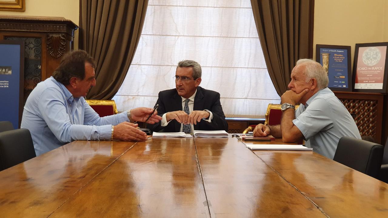 Στις συναντήσεις εργασίας, που πραγματοποιήθηκαν στο γραφείο του Περιφερειάρχη στη Ρόδο, έγινε διεξοδική εξέταση όλων των ανοιχτών ζητημάτων της Σαντορίνης, ιεράρχηση και προτεραιοποίηση των στόχων που από κοινού, Δήμος και Περιφέρεια θα υπηρετήσουν, προκειμένου να ξεκινήσει άμεσα η παραγωγή έργου.