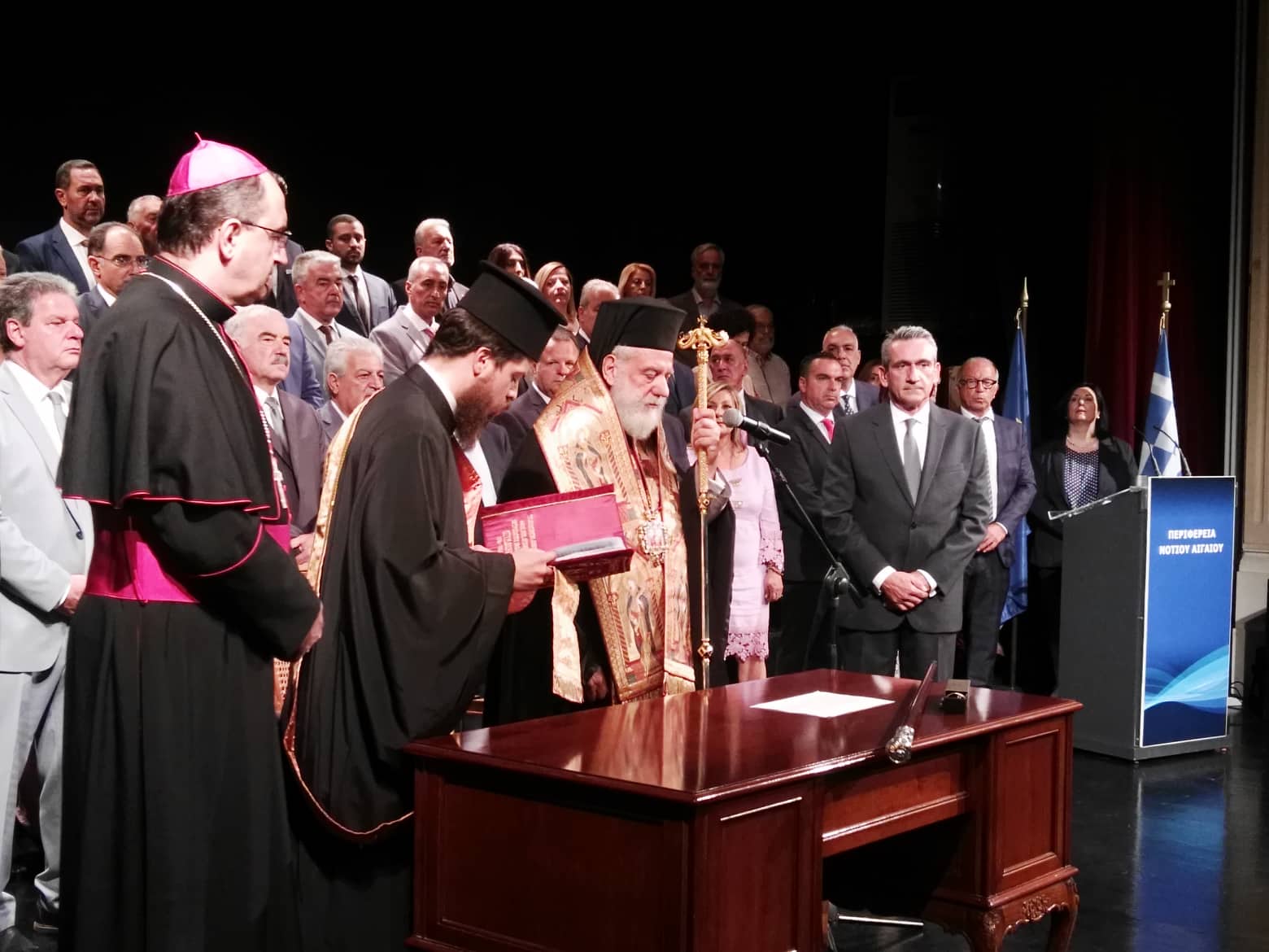 Την ορκωμοσία τέλεσε ο Σεβασμιώτατος Μητροπολίτης Σύρου κ. Δωρόθεος Β΄, ενώ παρέστη και ο Επίσκοπος των Καθολικών, Σεβ. π. Πέτρος Στεφάνου.