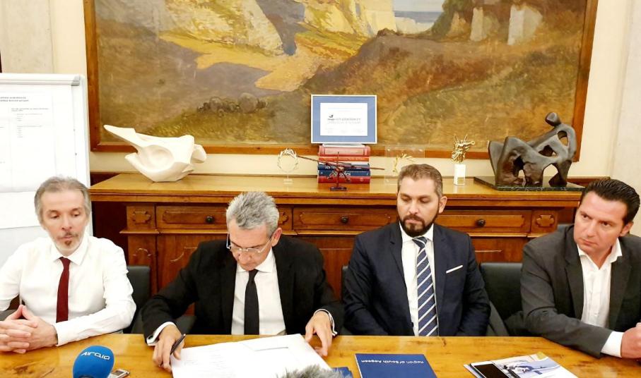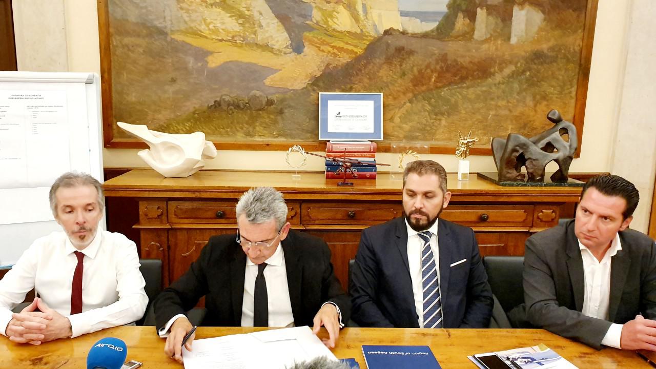 Ο Περιφερειάρχης και οι εκπρόσωποι τριών εταιρειών που συνθέτουν το ανάδοχο σχήμα με την επωνυμία «Υδατοδρόμια Νοτίου Αιγαίου», το οποίο προέκυψε μετά από διεθνή διαγωνισμό, υπέγραψαν σήμερα τη σύμβαση ανάδειξης αναδόχου για την αδειοδότηση 20 συνολικά υδατοδρομίων, σε 19 νησιά της Περιφέρειας Νοτίου Αιγαίου.