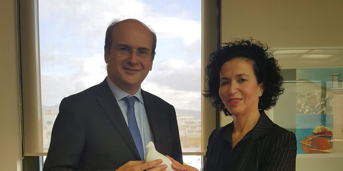 Η κ. Δεληγιάννη παρέδωσε στον Υπουργό συμβολικά το Μαρμάρινο Περιστέρι της Ειρήνης που το πρόσφερε και φιλοτέχνησε ο Τηνιακός Μαρμαρογλύπτης, Πέτρος Μαρμαρινός και μετέφερε στον Υπουργό όλες τις ιδιαιτερότητες και τα χαρακτηριστικά των νησιών μας που θα πρέπει να προστατευθούν από την αδιάκριτη εγκατάσταση αιολικών.