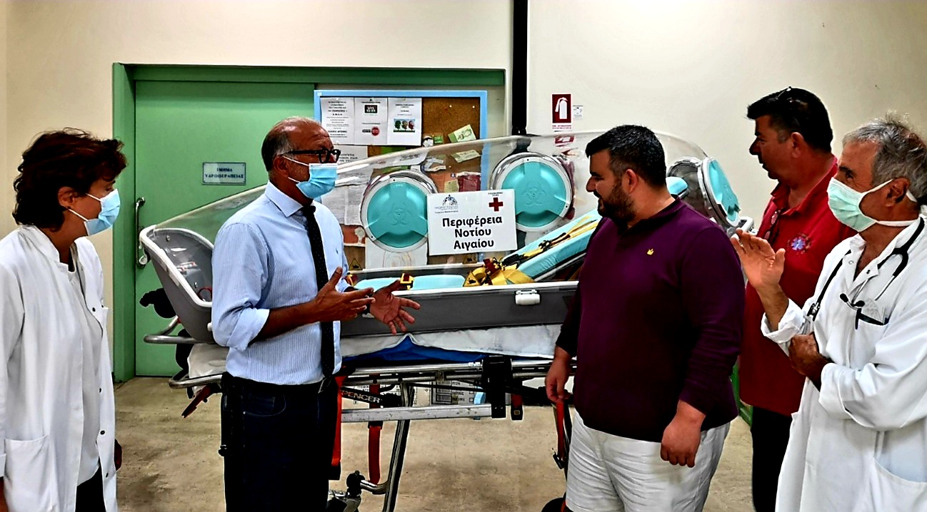 Στο πλαίσιο των πρωτοβουλιών της Περιφερειακής Αρχής Νοτίου Αιγαίου για την αντιμετώπιση της πανδημίας, πραγματοποιήθηκε σήμερα το μεσημέρι η επίσημη παραλαβή ενός εκ των δύο υπερσύγχρονων ειδικών θαλάμων αρνητικής πίεσης (κάψουλες) που αγοράστηκαν με δαπάνες της, στο Γενικό Νοσοκομείο της Σύρου, προκειμένου να χρησιμοποιηθεί, από το ΕΚΑΒ που εδρεύει στο νησί, για αεροδιακομιδές ασθενών κρούσματος COVID-19 και άλλων λοιμωδών νοσημάτων.