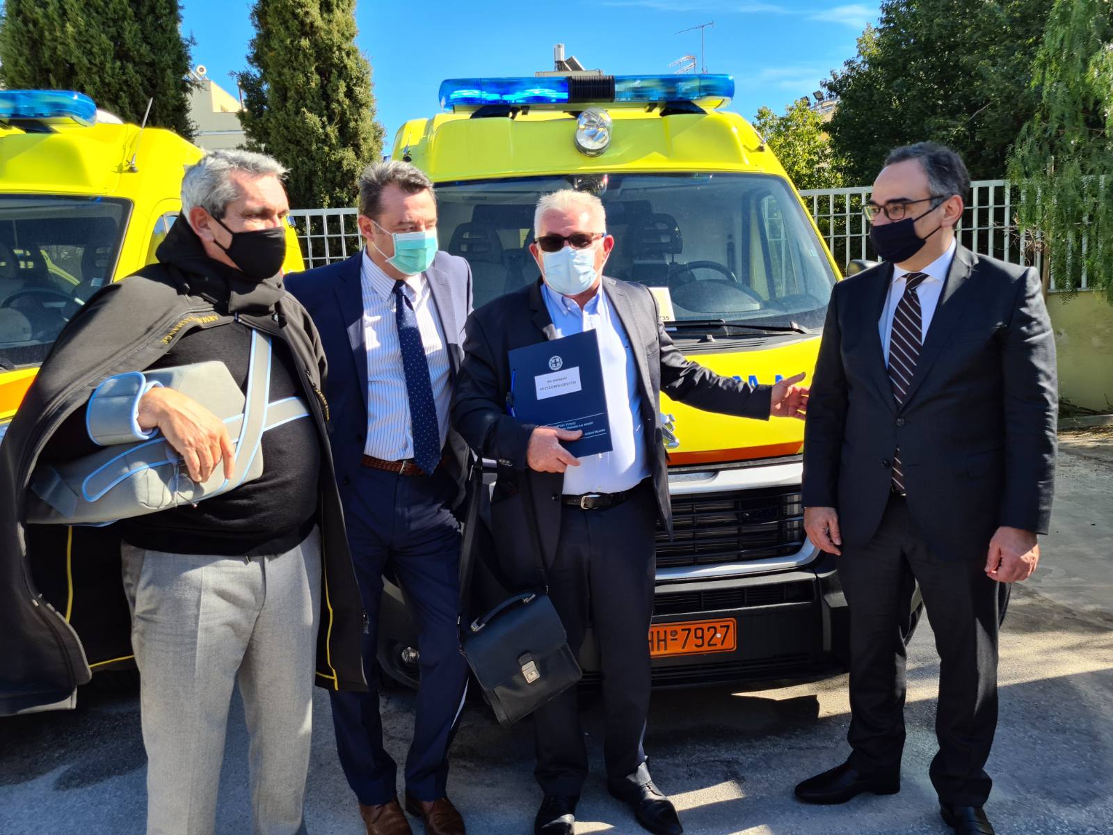 Η προμήθεια των ασθενοφόρων – 38 στο σύνολό τους - χρηματοδοτήθηκε με ευρωπαϊκούς πόρους του περιφερειακού Επιχειρησιακού Προγράμματος "Νότιο Αιγαίο 2014 - 2020" στο πλαίσιο του ΕΣΠΑ. Τα ασθενοφόρα παρέδωσαν ο Αναπληρωτής Υπουργός Υγείας, Βασίλης Κοντοζαμάνης , ο Περιφερειάρχης Ν. Αιγαίου, Γιώργος Χατζημάρκος και ο Διοικητής της 2ης ΥΠΕ Πειραιώς και Αιγαίου, Χρήστος Ροϊλός.