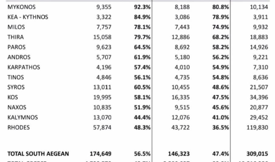Αμέσως μετά παρουσίασε τα στοιχεία ανά περιφερειακή ενότητα. Τα πρώτα ποσοστά είναι για τον εμβολιασμό με μία δόση και τα δεύτερα αφορούν τον ολοκληρωμένο εμβολιασμό. Συγκεκριμένα: Μύκονος 92,3% (μία δόση) και 80,8% (ολοκληρωμένος εμβολιασμός. Κέα - Κύθνος (84,9% και 78,9%). Μήλος (78,1% και 74,9%). Θήρα (79,7% και 68,2%). Πάρος (64,5% και 58,2%). Άνδρος (61,9% και 56,2%). Κάρπαθος (57,4% και 54,9%). Τήνος 56,1% και 54,8%). Σύρος (60,5% και 48,6%). Κως (58,1% και 47,5%). Νάξος (51,9% και 45,6%). Κάλυμνος (44,4% και 41,0%). Ρόδος (48,3% και 36,5%).