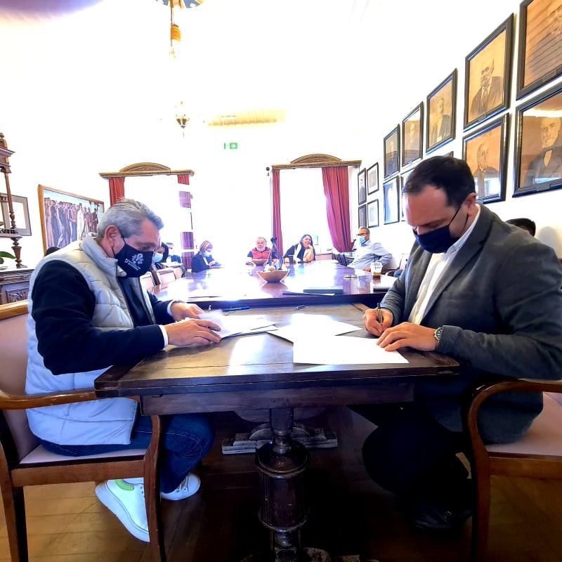 Στην υπογραφή του Πρωτοκόλλου παράδοσης – παραλαβής του Χώρου Υγειονομικής Ταφής Απορριμμάτων Μυκόνου από το Δήμο (Μυκόνου) στον ΦοΔΣΑ Νοτίου Αιγαίου, προέβησαν χθες ο Περιφερειάρχης και Πρόεδρος του ΦοΔΣΑ Νοτίου Αιγαίου Α.Ε., Γιώργος Χατζημάρκος και ο Δήμαρχος Μυκόνου Κωνσταντίνος Κουκάς.