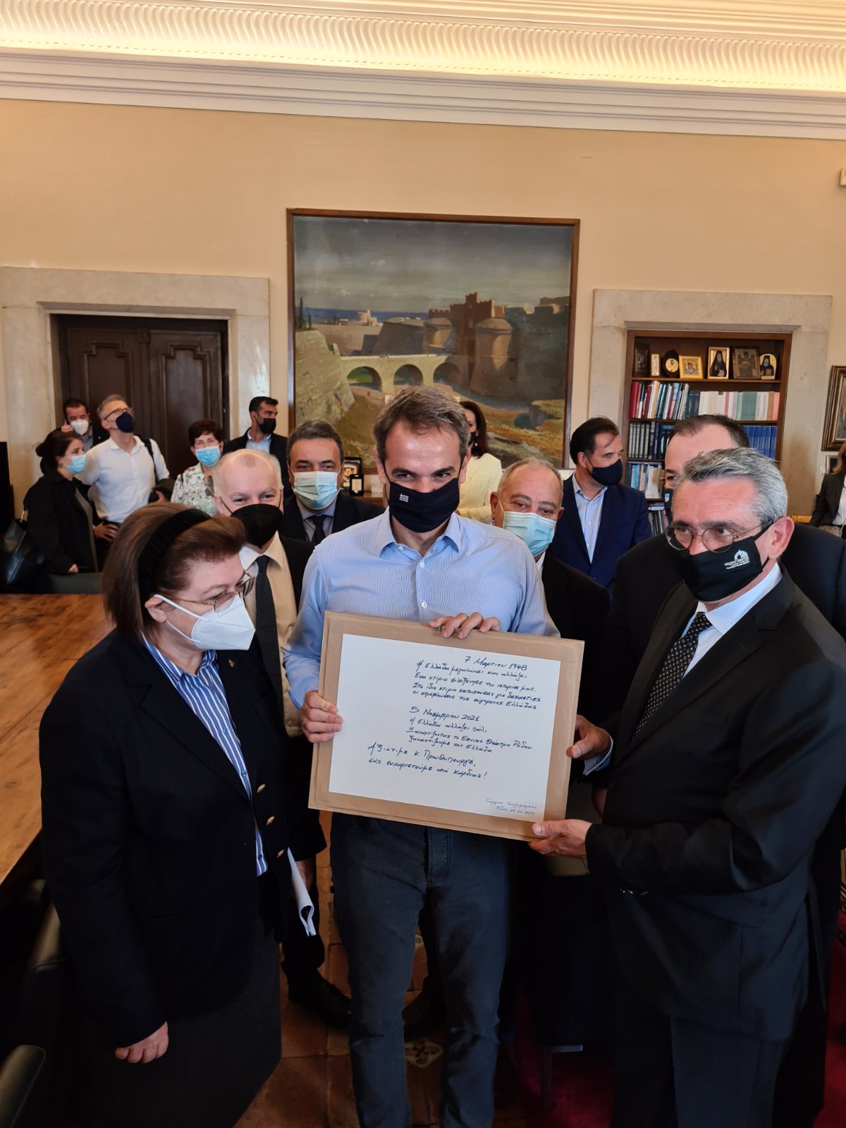 Με την άφιξή τους, κατευθύνθηκαν αμέσως στο κτίριο του Εθνικού Θεάτρου, όπου τους υποδέχτηκαν ο Περιφερειάρχης και ο Δήμαρχος Ρόδου. Ο Πρωθυπουργός και οι Υπουργοί ξεναγήθηκαν στις εγκαταστάσεις του όπου διαπίστωσαν την κατάσταση στην οποία έχει περιέλθει το κτίριο με την πάροδο του χρόνου. Ο κ. Μητσοτάκης ενημερώθηκε από την Υπουργό Πολιτισμού Λίνα Μενδώνη σχετικά με την πρόοδο των μελετών για την αποκατάστασή του και εξήγγειλε την χρηματοδότηση του έργου από πόρους του Υπουργείου Πολιτισμού. Παράλληλα, εξήρε την άριστη συνεργασία της Περιφέρειας Νοτίου Αιγαίου και του Δήμου Ρόδου με το Υπουργείο Πολιτισμού, λέγοντας χαρακτηριστικά, «αυτό το μοντέλο της συνεργασίας θέλουμε».