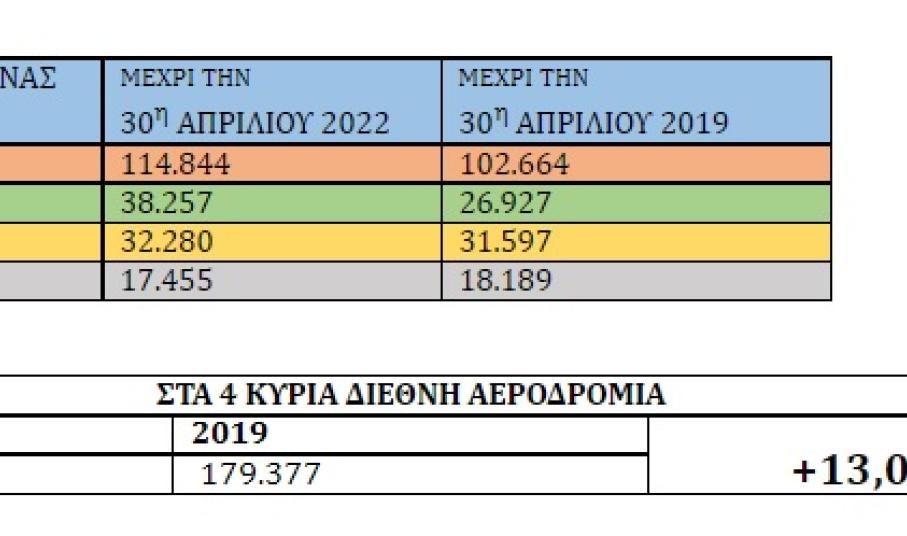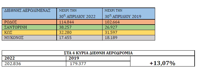 Συγκεκριμένα, και τα πέντε νησιά του Νοτίου Αιγαίου με τους διεθνείς αερολιμένες ξεκίνησαν πολύ δυναμικά, ξεπερνώντας μέχρι τις 30 Απριλίου κατά 13,07%, τον αριθμό των επισκεπτών του 2019, με περισσότερες από 1.300 διεθνείς πτήσεις, με υψηλές πληρότητες, που έφεραν στα νησιά ήδη περισσότερους από 200.000 επιβάτες.