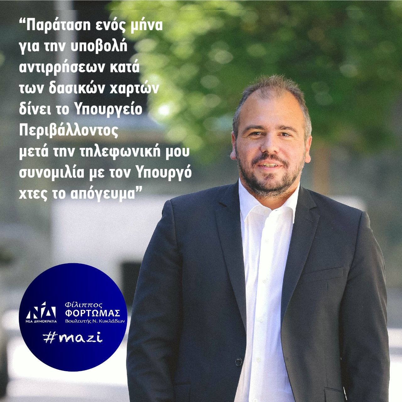 Πιο συγκεκριμένα, ο βουλευτής Κυκλάδων της Νέας Δημοκρατίας, αφουγκραζόμενος την αγωνία των Κυκλαδιτών, καθώς ένα μεγάλο μέρος τους δεν έχει καταφέρει να ολοκληρώσει αυτή τη διαδικασία, επικοινώνησε προσωπικά με την ηγεσία του Υπουργείου Περιβάλλοντος και Ενέργειας, προκειμένου να δοθεί εκ νέου παράταση της εν λόγω προθεσμίας, ώστε να διευκολυνθεί ο κόσμος. Ο Υπουργός δεσμεύτηκε ότι άμεσα θα έρθει νομοθετική ρύθμιση, δυνάμει της οποίας θα δίνεται παράταση για ένα μήνα ακόμα, για την υποβολή αντιρρήσεων κατά των δασικών χαρτών.