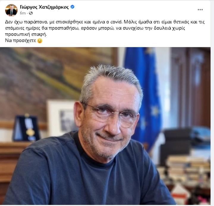 Θετικός στον κορωνοϊό διαγνώστηκε ο περιφερειάρχης Ν. Αιγαίου, Γιώργος Χατζημάρκος o oποίος γνωστοποίησε το γεγονός με ανάρτηση του στα μέσα κοινωνικής δικτύωσης: