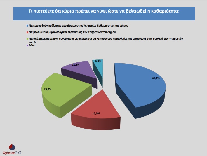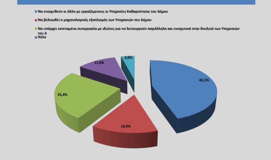 Σε συνέχεια των ανωτέρω ακολούθησε η ερώτηση για το τι πιστεύουν οι πολίτες ότι χρειάζεται κύρια για να βελτιωθεί η καθαριότητα. Το 45,1% στο Ν. Αιγαίο απάντησε την ενίσχυση των υπηρεσιών με ανθρώπινο δυναμικό, το 25,4% να υπάρχει εκτεταμένη συνεργασία με ιδιώτες για να λειτουργούν παράλληλα και ενισχυτικά στη δουλειά των Υπηρεσιών, το 13,9% να βελτιωθεί ο μηχανολογικός εξοπλισμός των υπηρεσιών και το υπόλοιπο ποσοστό απάντησε κάτι άλλο.