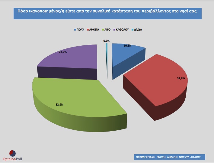 Η έρευνα έχει εστιάσει στην καταγραφή των απόψεων των νησιωτών ειδικότερα και για το θέμα της διαχείρισης απορριμμάτων. Αναλυτικά, στην ερώτηση αν οι πολίτες είναι ικανοποιημένοι με την καθαριότητα στις παραλίες του νησιού, συνολικά στο Ν. Αιγαίο απάντησε το 33,4% ναι, στις πλατείες και στα πάρκα το 35,9% όχι, όπως επίσης μέσα στις πόλεις και τα χωριά απάντησε αρνητικά το 37,8%.