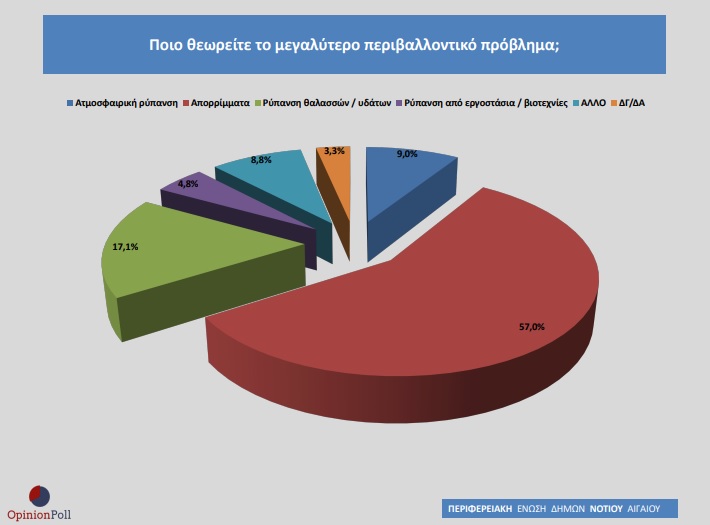 Ιδιαίτερο ενδιαφέρον παρουσιάζουν τα αποτελέσματα στο Νότιο Αιγαίο συνολικά σχετικά με την ερώτηση ποιο είναι το μεγαλύτερο περιβαλλοντικό πρόβλημα στα νησιά. Σε ποσοστό 57,0% οι νησιώτες απάντησαν τα απορρίμματα, σε ποσοστό 17,1% η θαλάσσια ρύπανση, σε ποσοστό 4,8% η ρύπανση από εργοστάσια και βιοτεχνίες και το 9,0% έδειξε την ατμοσφαιρική ρύπανση.