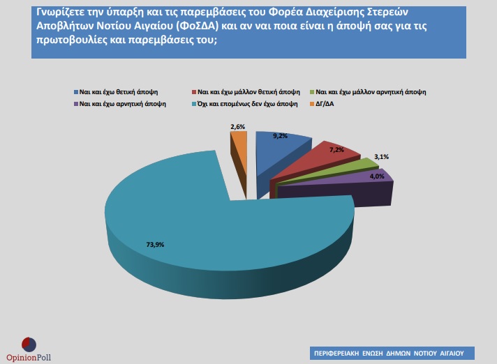 Ακόμη συνολικά το Ν. Αιγαίο ρωτήθηκε αν γνωρίζει τον ΦΟΔΣΑ Ν. Αιγαίου και τη δράση του στα νησιά, τις πρωτοβουλίες και τις παρεμβάσεις του. Το 73,9% απάντησε όχι και πως επομένως δεν έχει άποψη, το 3,1% θετικά και πως έχει μάλλον αρνητική άποψη και μόλις το 9,2% απάντησε ναι και πως έχει θετική άποψη. Η συντριπτική πλειοψηφία των Περιφερειακών Ενοτήτων στον νησιώτικο χώρο του Νοτίου Αιγαίου απάντησε αρνητικά σε ποσοστά άνω του 60%.