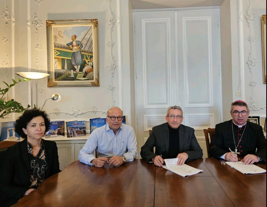 Ευχαριστώ την Υπουργό Πολιτισμού και Αθλητισμού κα Λίνα Μενδώνη, τον Σεβασμιότατο Αρχιεπίσκοπο π. Ιωσήφ Πρίντεζη, τον Περιφερειάρχη Νοτίου Αιγαίου κ. Γ. Χατζημάρκο και τον Χωρικό Αντιπεριφερειάρχη Κυκλάδων κ. Γ. Λεονταρίτη για την προσήλωσή τους στην ολοκλήρωση αυτής της προγραμματικής μελέτης που σήμερα έφτασε στην υπογραφή της».