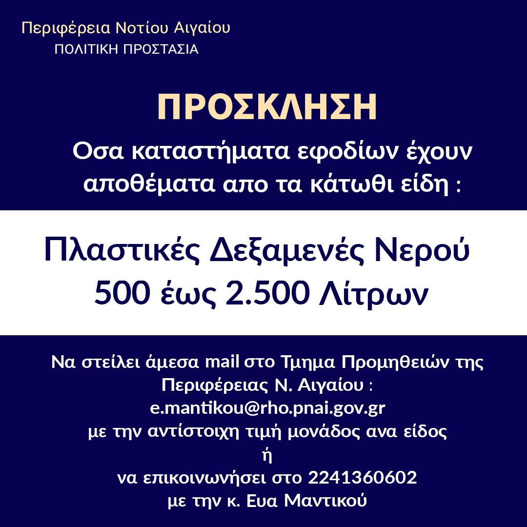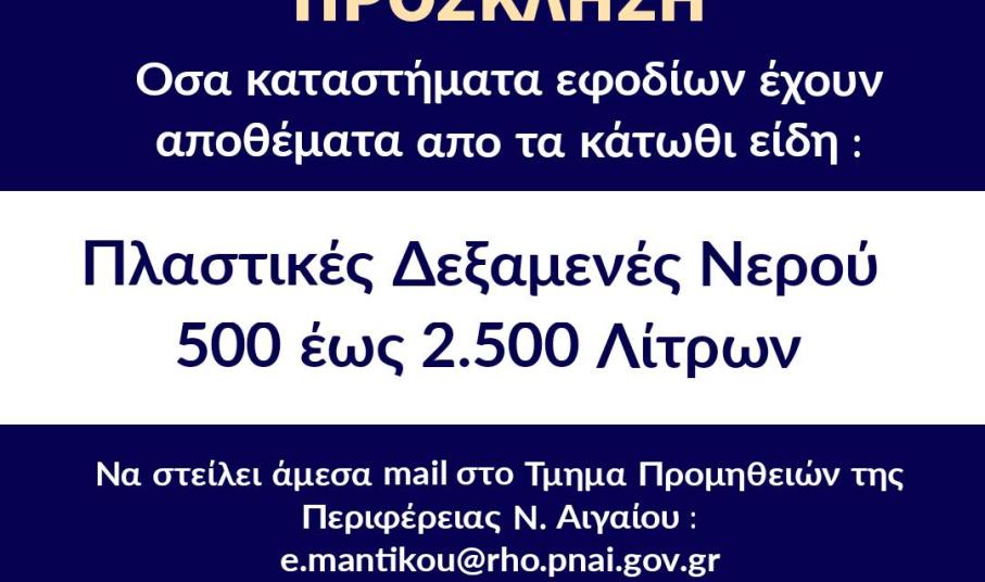 Παράλληλα, και δεδομένου ότι η δασική πυρκαγιά συνεχίζει το καταστροφικό της έργο, η Περιφέρεια Νοτίου Αιγαίου απευθύνει νέα πρόσκληση σε όσα καταστήματα εφοδίων έχουν αποθέματα από τα παρακάτω είδη: