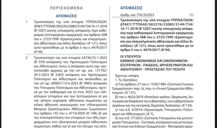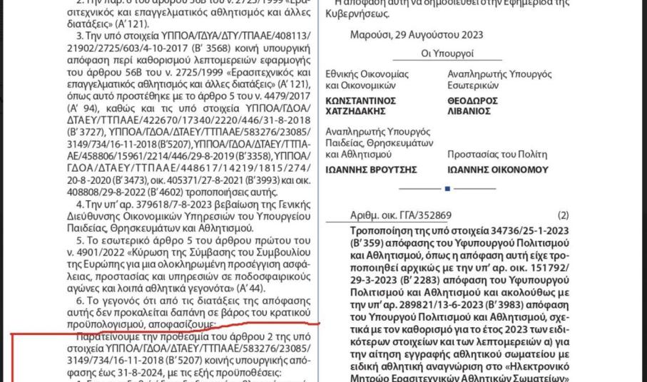 Επισυνάπτεται η σχετική υπουργική απόφαση, προς τροποποίηση της υπό στοιχεία ΥΠΠΟΑ/ΓΔΟΑ/ ΔΤΑΕΥ/ΤΤΠΑΑΕ/583276/23085/3149/734/ 16-11-2018 (Β’ 5207) κοινής υπουργικής απόφασης περί καθορισμού λεπτομερειών εφαρμογής του άρθρου 56Β του ν. 2725/1999 «Ερασιτεχνικός και επαγγελματικός αθλητισμός και άλλες διατάξεις» (Α’ 121), όπως αυτό προστέθηκε με το άρθρο 5 του ν. 4479/2017 (Α’ 94,