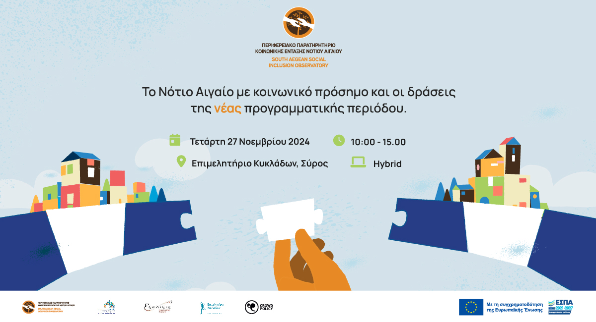 Ενημερωτική εκδήλωση του Παρατηρητηρίου Κοινωνικής Ένταξης της Περιφέρειας Νοτίου Αιγαίου που θα πραγματοποιηθεί την Τετάρτη 27/11/2024 στις 10 π.μ. στο Επιμελητήριο Κυκλάδων της Σύρου.