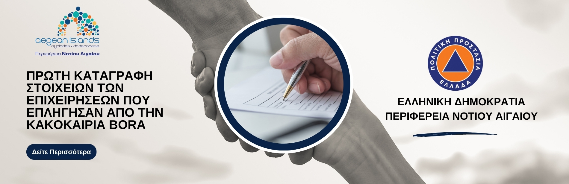 Στην ηλεκτρονική διεύθυνση www.pnai.gov.gr/bora, πληγείσες επιχειρήσεις της Ρόδου και του Νοτίου Αιγαίου μπορούν να υποβάλουν ηλεκτρονικά το αίτημά τους, χωρίς να απαιτείται εκ μέρους τους κάποια άλλη ενέργεια, όπως ταχυδρομική αποστολή ή φυσική παρουσία, προκειμένου, συμπληρώνοντας τα στοιχεία τους, να δηλώσουν ότι έχουν υποστεί ζημιές και να αιτηθούν την καταγραφή τους από τις Επιτροπές που συγκροτούνται ειδικώς γι’ αυτό τον σκοπό.
