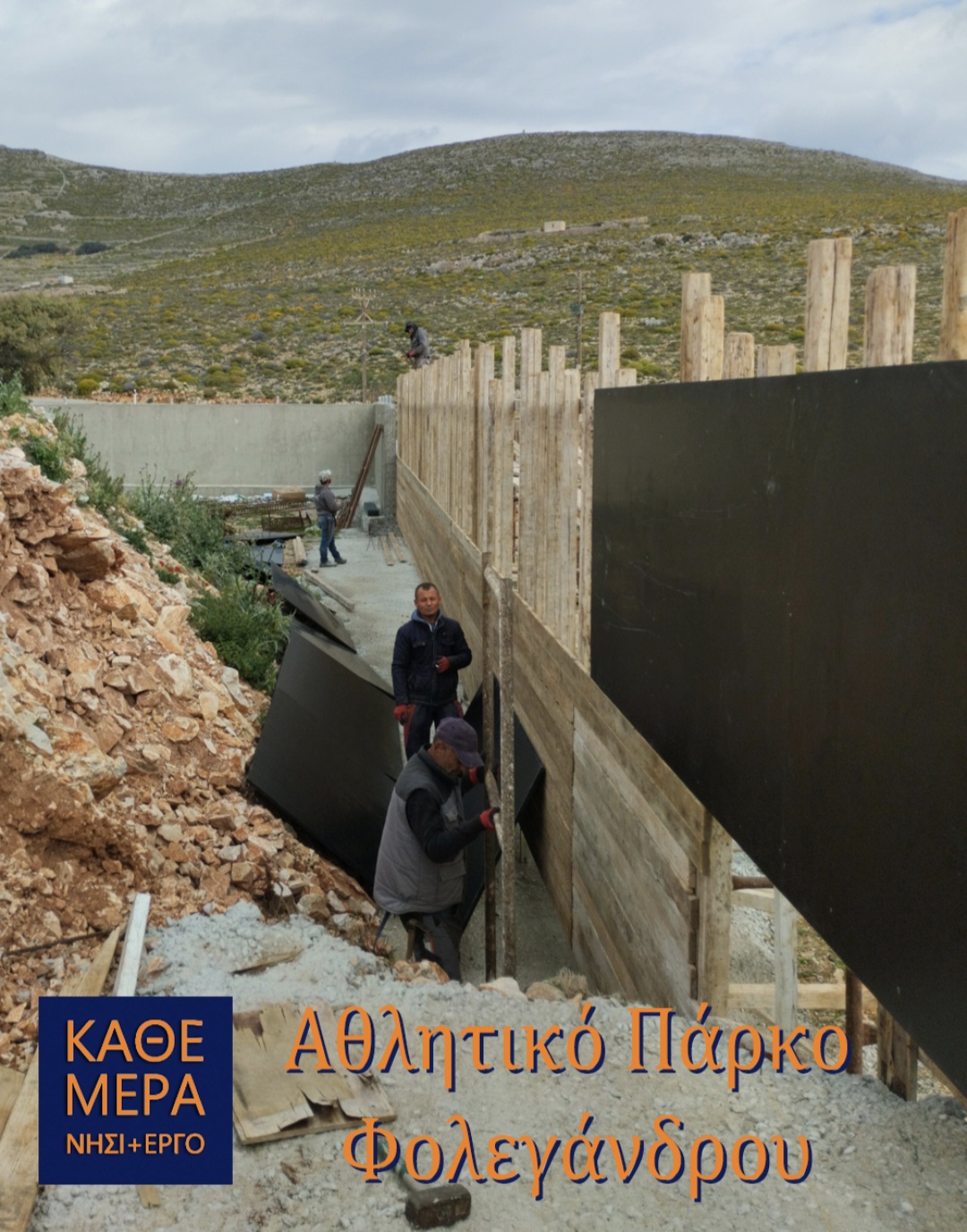 Μετά την ολοκλήρωση της επισκευής όλων των σχολικών μονάδων της Φολεγάνδρου από την Περιφέρεια Νοτίου Αιγαίου και την ανακατασκευή του γηπέδου μπάσκετ, το οποίο κατέστη σύγχρονο και ασφαλές, βρίσκεται σε πλήρη εξέλιξη η κατασκευή ενός πολυαναμενόμενου έργου για το νησί. Αυτό της δημιουργίας ενός αθλητικού πάρκου, που θα περιλαμβάνει γήπεδο ποδοσφαίρου 5Χ5 με χλοοτάπητα πέμπτης γενιάς και ηλεκτροφωτισμό με φωτιστικά σώματα led καθώς και γήπεδο τένις.