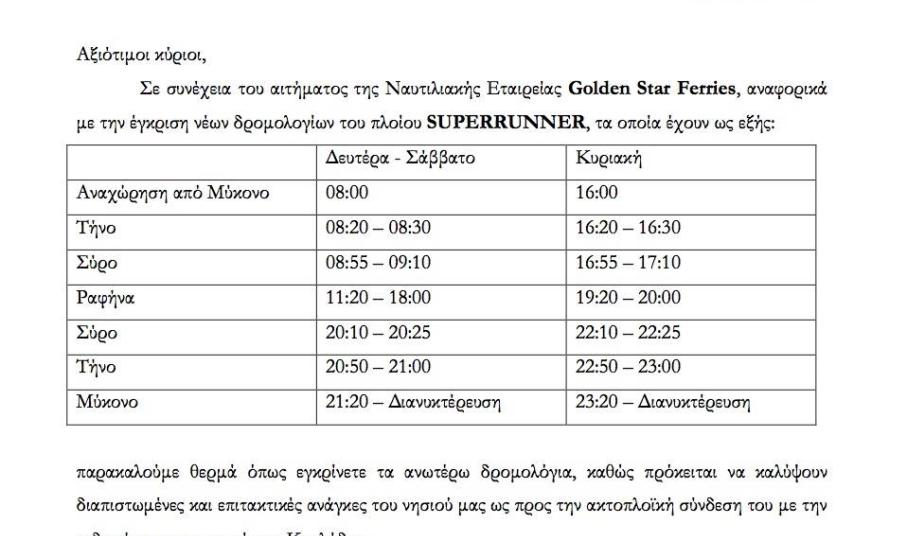 Ο Δήμος Σύρου - Ερμούπολης στηρίζει επισήμως το αίτημα της Golden Star Ferries προς το Συμβούλιο Ακτοπλοϊκών Συγκοινωνιών (ΣΑΣ) για την άμεση σύνδεση της Σύρου με το λιμάνι της Ραφήνας, για πρώτη φορά με ταχύπλοο μέχρι το τέλος της τρέχουσας δρομολογιακής περιόδου.
