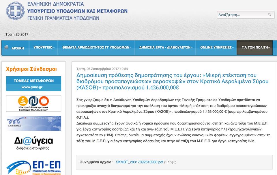 Θετικό αποτέλεσμα δίδουν οι πολύμηνες προσπάθειες βελτίωσης των δυνατοτήτων του αεροδρομίου Σύρου, με φόντο την εξαιρετικά αισιόδοξη εξέλιξη της χθεσινής δημοσιοποίησης της πρόθεσης δημοπράτησης του έργου επέκτασης του διαδρόμου προσαπογειώσεων στην ιστοσελίδα του Υπ. Υποδομών, Μεταφορών και Δικτύων και στη Γενική Γραμματεία Δημόσιων Έργων.