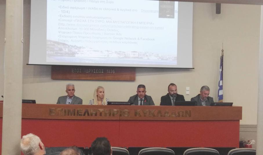 Παρουσία αιρετών μελών του Δήμου Σύρου – Ερμούπολης, μελών της Τουριστική Επιτροπής, αλλά κι εκπροσώπων επαγγελματιών, επιχειρηματιών του τουρισμού και προσώπων από τον χώρο της εστίασης και της εμπορικής τάξης της Σύρου, ο δήμαρχος Σύρου – Ερμούπολης, Γιώργος Μαραγκός, ο πρόεδρος της Τουριστικής Επιτροπής, Δομένικος Σαγκινέτος, η αντιδήμαρχος Πολιτισμού, Θωμαή Μενδρινού, ο πρόεδρος του Λιμενικού Ταμείου Σύρου, Δημήτρης Κοσμάς και ο εντεταλμένος δημοτικός σύμβουλος Αθλητισμού, Γουλιέλμος Πρίντεζης προχώρησαν στη διατύπωση των βασικών κατευθύνσεων που ακολουθεί η Σύρος για την τουριστική ανάπτυξή της.