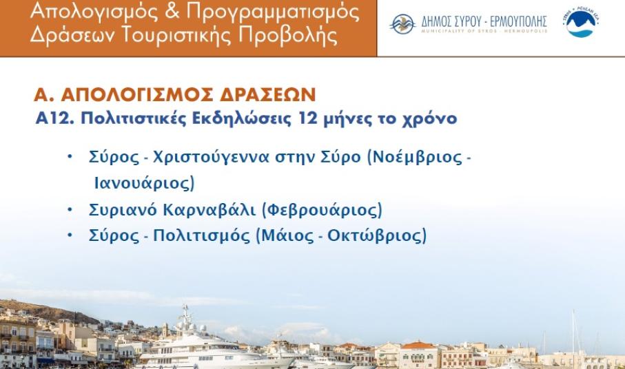 Μεταξύ των ομιλητών του πάνελ και η αντιδήμαρχος Πολιτισμού, Θωμαή Μενδρινού η οποία αφού επεσήμανε πως, καθ΄ όλη τη διάρκεια του έτους στο νησί πραγματοποιούνται περισσότερες από 250 εκδηλώσεις, έδωσε έμφαση στην προσπάθεια του τμήματος πολιτισμού να προγραμματίσει έγκαιρα την πολιτιστική ατζέντα του τόπου, με στόχο τη δυναμική προώθησή της, στον άξονα της ανάδειξης της πλούσιας πολιτιστικής ταυτότητας της Σύρου, αλλά και της προσέλκυσης επισκεπτών.