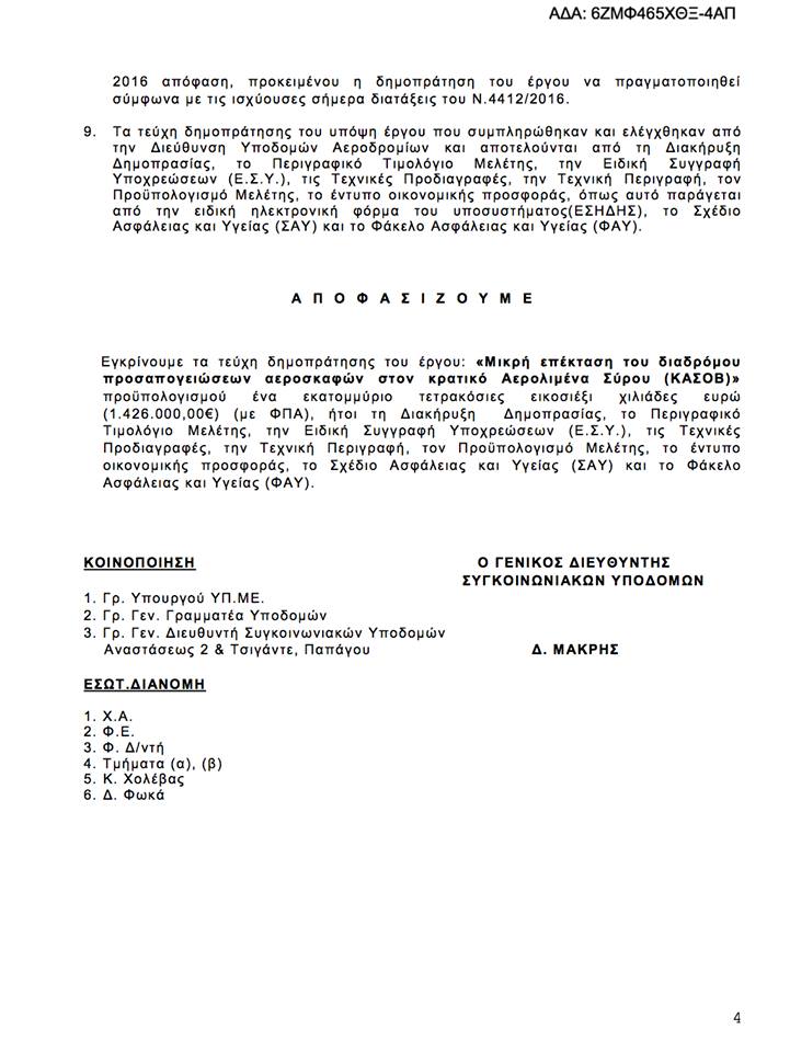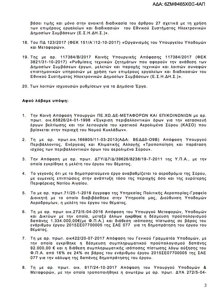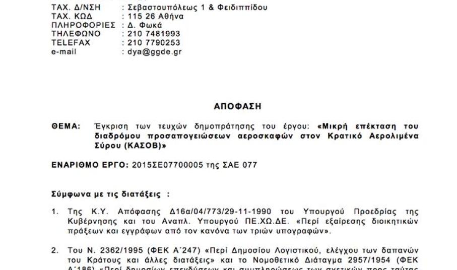 Όπως είχε αναφερθεί σε σχετικό άρθρο μας το οποίο είχε δημοσιευθεί στις 27/09/2017, ο Δήμαρχος κ. Γεώργιος Μαραγκός, με σημερινή προσωπική του ανακοίνωση, επιβεβαιώνει την οριστική έγκριση της δημοπράτησης του έργου για την επέκταση του Αεροδρομίου Σύρου, με ημερομηνία διαγωνισμού την 23/01/2018, και επισυνάπτει τα σχετικά έγγραφα.