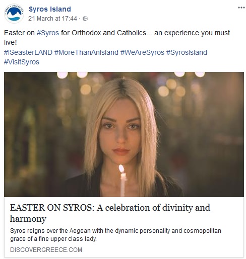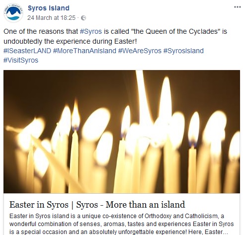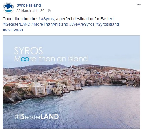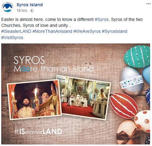 Βάσει του πλάνου που αναπτύσσει ο Δήμος Σύρου – Ερμούπολης για τη φετινή Πασχαλινή περίοδο στη Σύρο και την προβολή του νησιού, αξιοποιείται – πλέον – πλήρως η υπηρεσία web marketing κι ως εκ τούτου, η προώθηση μέσω των social media.