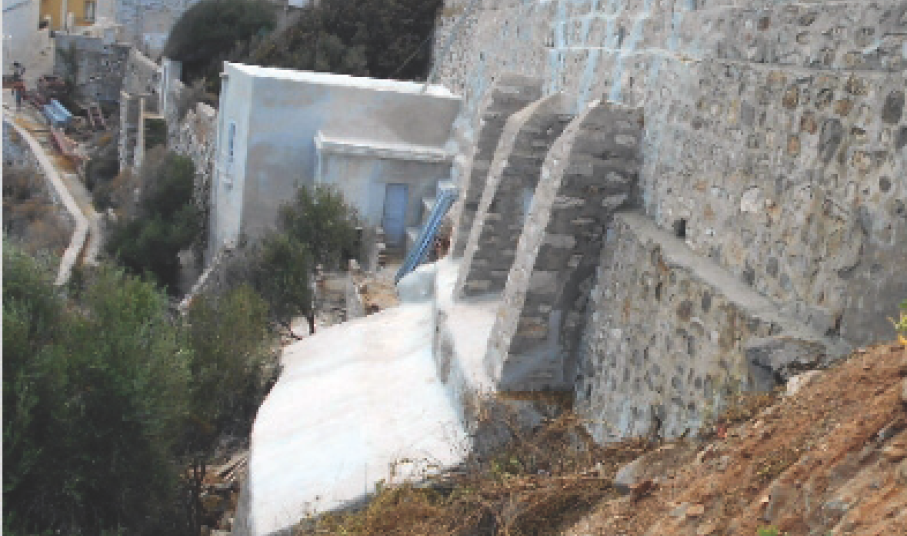 Το πλεονέκτημα αυτής της παρέμβασης είναι ότι προσφέρει ευστάθεια στο τοιχίο, αποφεύγοντας τα α φαινόμενα αποκολλήσεων που παρατηρούνται τώρα, ενώ ο δρόμος, κατά την εκτέλεση των εργασιών, μπορεί να παραμείνει σε λειτουργία καθώς το έργο θα εκτελεστεί από την εξωτερική πλευρά.