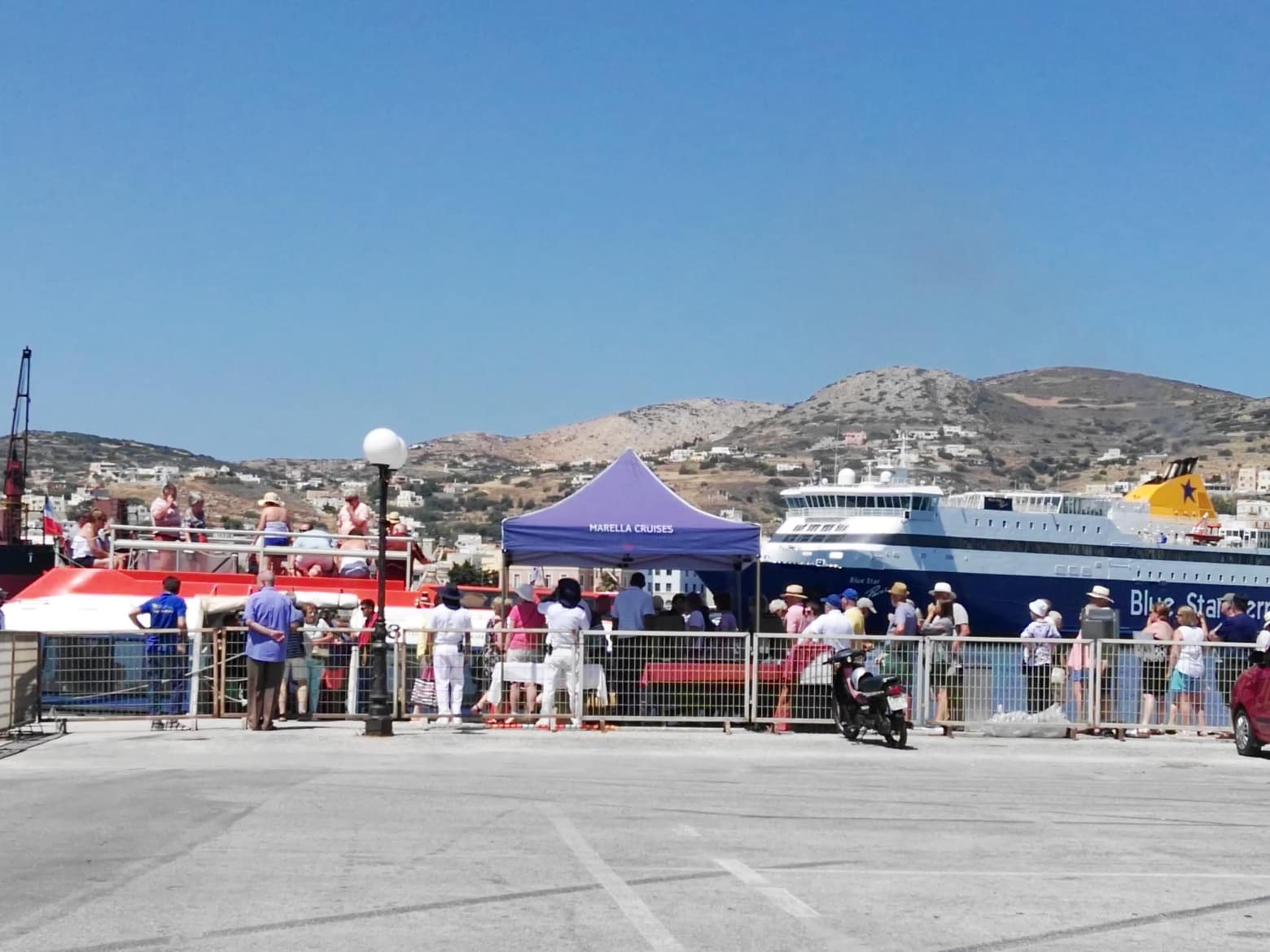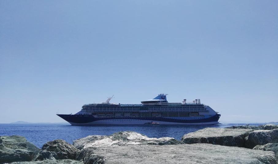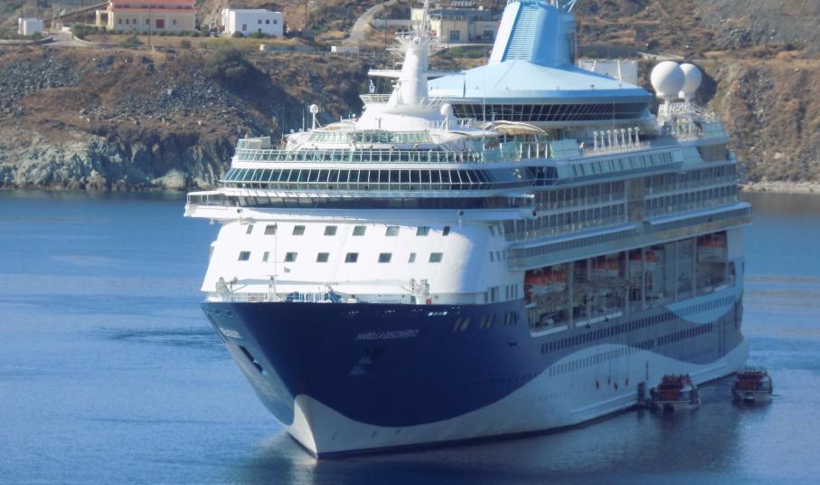 Οι 1.800 επιβάτες του «Marella Discovery 2», βγήκαν στη Σύρο με τα βοηθητικά πλωτά μέσα του πλοίου, καθώς με απόφαση του καπετάνιου προτιμήθηκε να μην εισέλθει στις λιμενικές εγκαταστάσεις της Ερμούπολης και να μείνει αρόδου.