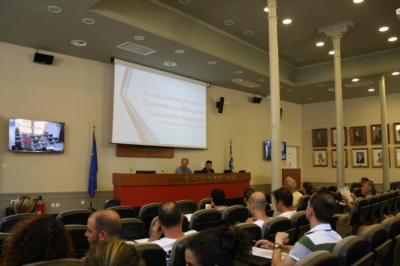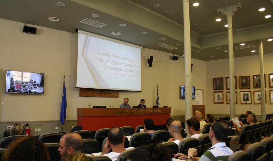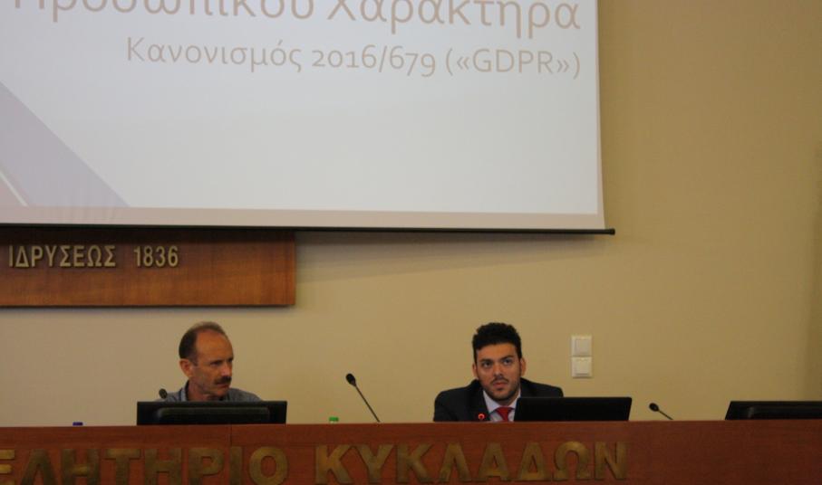Τη Δευτέρα 16 Ιουλίου 2018 το Επιμελητήριο Κυκλάδων πραγματοποίησε για τις επιχειρήσεις-μέλη του ενημερωτική εκδήλωση με θέμα «Προσωπικά Δεδομένα & Επιχειρήσεις» σχετικά με το νέο Ευρωπαϊκό Κανονισμό Προστασία Δεδομένων, GDPR (General Data Protection Regulation), ο οποίος έχει τεθεί σε εφαρμογή από 25 Μαΐου 2018. Ο συγκεκριμένος κανονισμός αφορά κάθε φορέα και επιχείρηση που επεξεργάζεται, διαχειρίζεται ή διατηρεί προσωπικά δεδομένα για τους εργαζόμενους, τους προμηθευτές ή τους πελάτες της. Πρόκειται για ένα πολυδιάστατο θέμα υψίστης σημασίας, για το οποίο θα πρέπει να είναι επαρκώς ενημερωμένοι όλοι οι επιχειρηματίες του Νομού, είτε τους αφορά περισσότερο είτε λιγότερο.