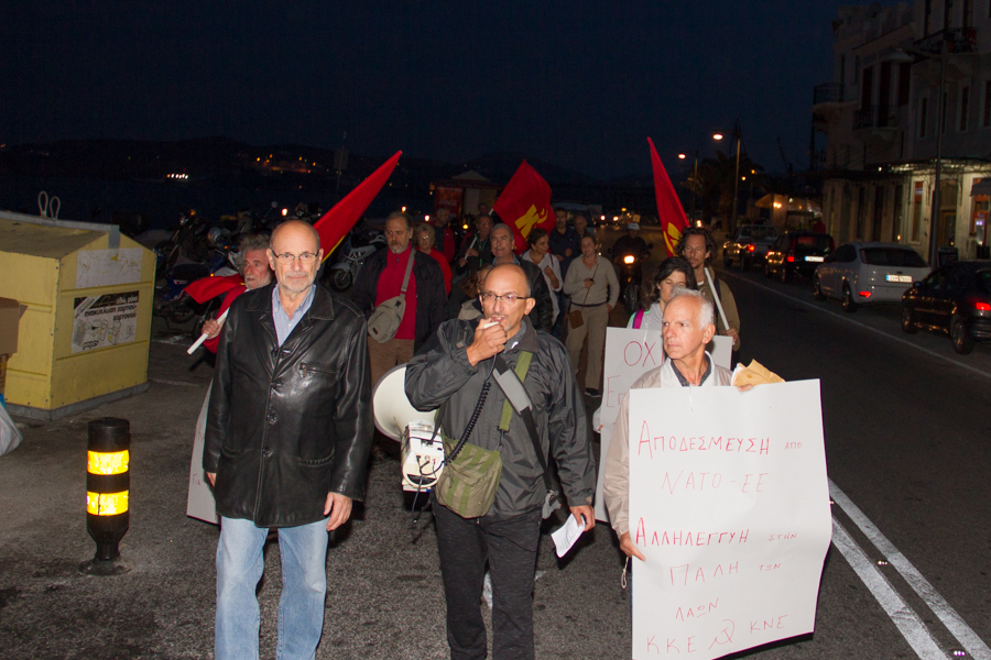 Στην συνέχεια ακολούθησε πικετοφορία στους δρόμους της πόλης με κεντρικό σύνθημα «Έξω το ΝΑΤΟ, να φύγουμε οι βάσεις, καμιά συμμετοχή στις επεμβάσεις». Νωρίτερα το πρωί ο κ.Τάσσος επισκέφθηκε, στα πλαίσια της περιοδείας του, τους εργαζόμενους στην αποκεντρωμένη διοίκηση ν. Αιγαίου