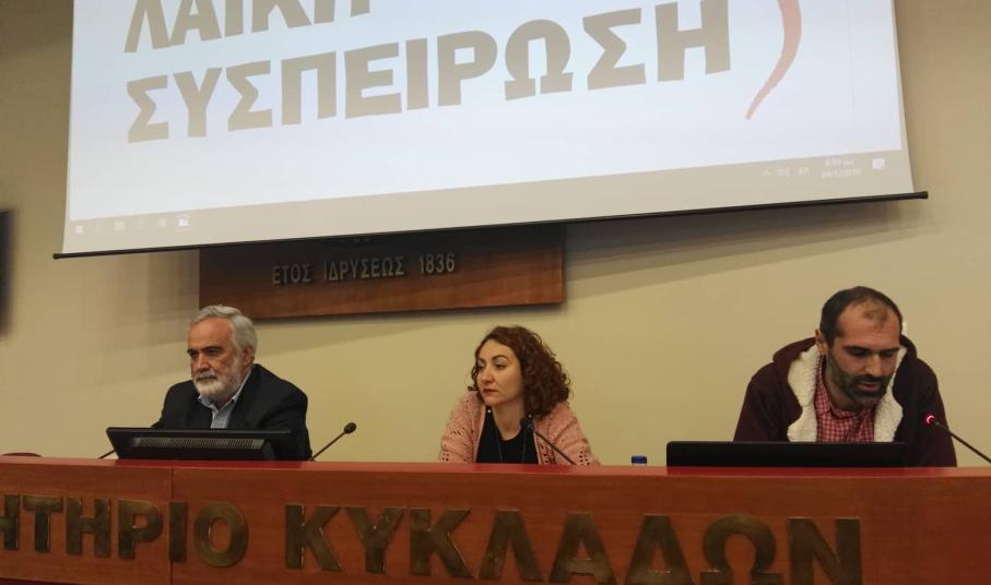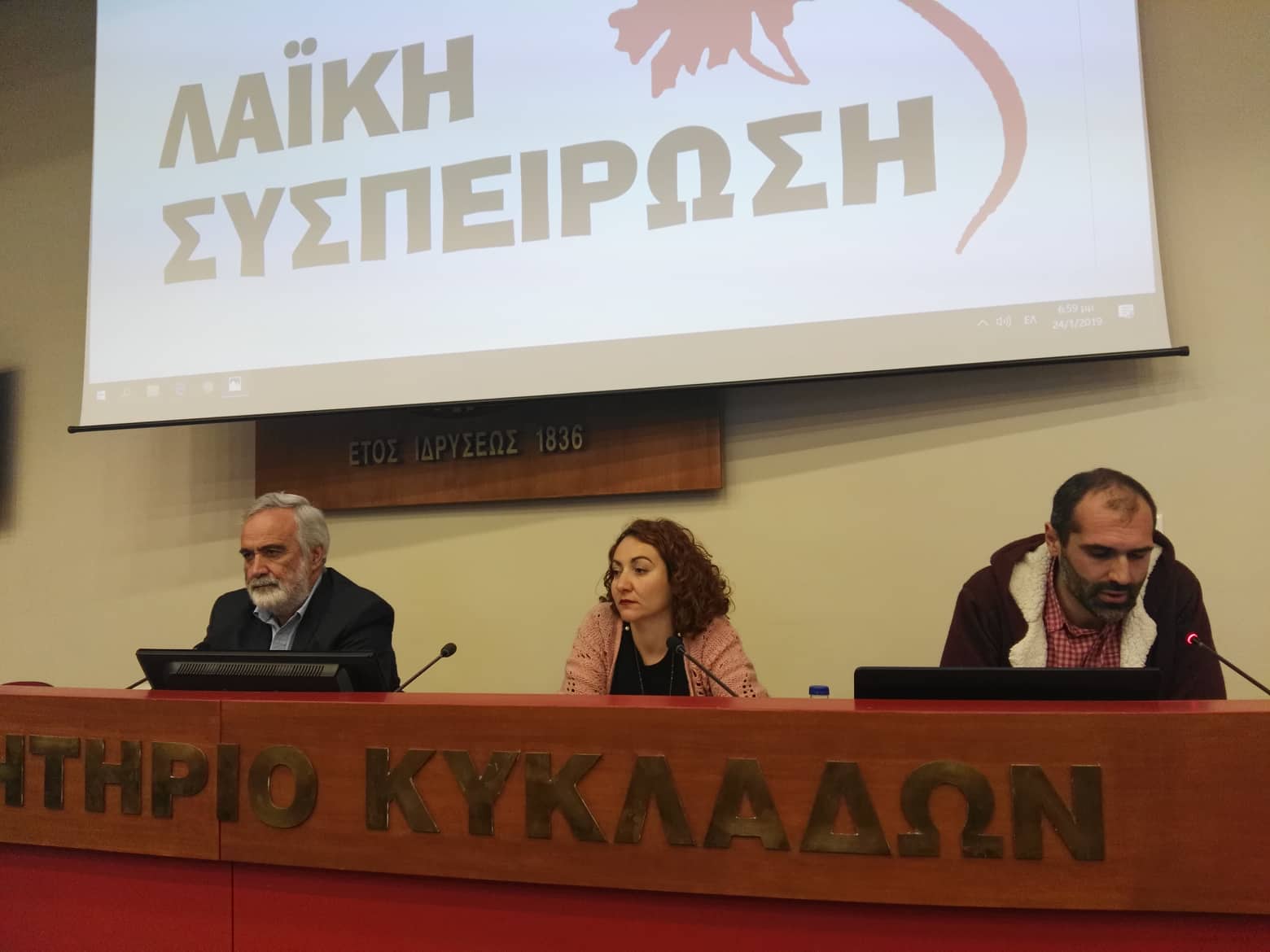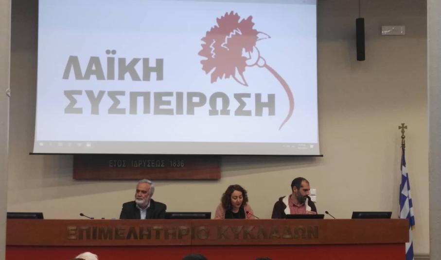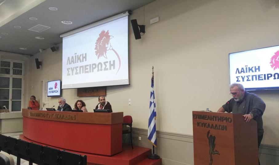 Σε συστράτευση με τη Λαϊκή Συσπείρωση κάλεσαν τους πολίτες, οι επικεφαλής των ψηφοδελτίων σε Περιφέρεια Ν. Αιγαίου και Δήμο Σύρου - Ερμούπολης, Γιάννης Ντουνιαδάκης και Νικόλας Καΐλης, αντίστοιχα, κατά τη διάρκεια των ομιλιών τους, στο πλαίσιο της πολιτικής εκδήλωσης του ΚΚΕ στη Σύρο ενόψει των επερχόμενων εκλογών στην Αυτοδιοίκηση.