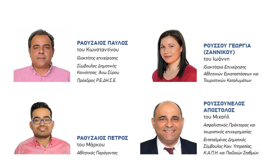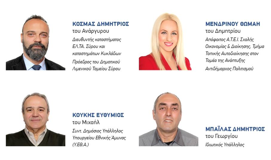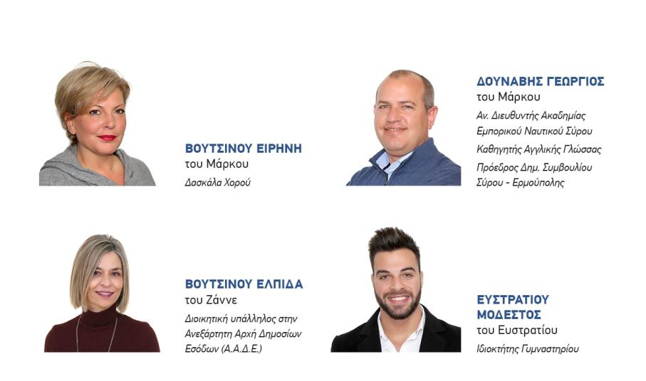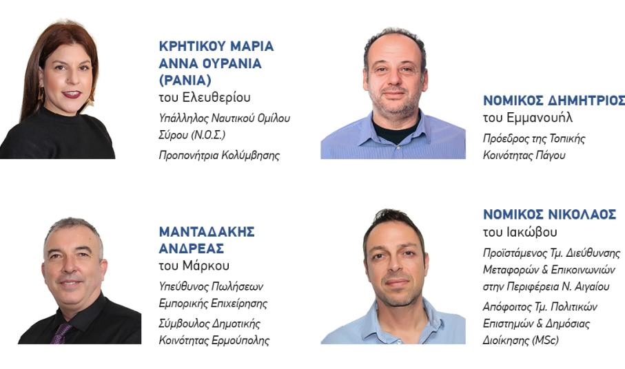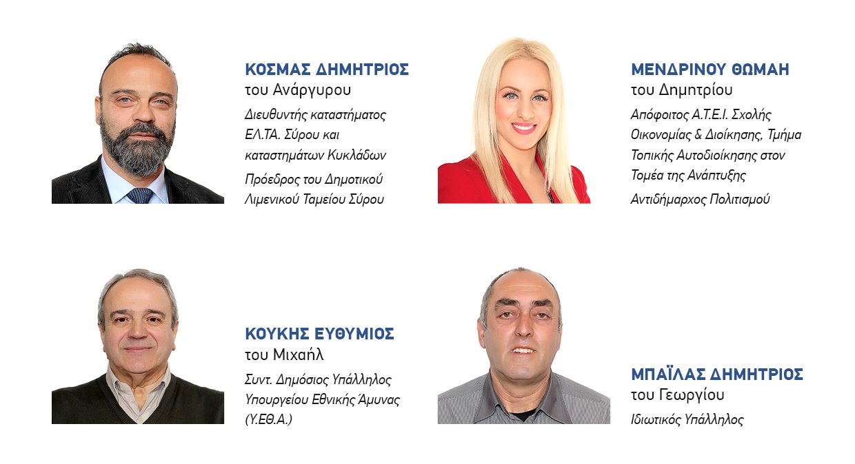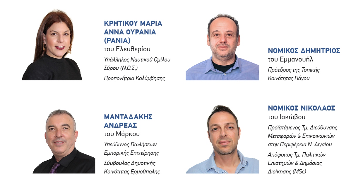 Για να γίνουν, όμως, όλα αυτά, χρειάζεται να εμπιστευθούμε ανθρώπους με όραμα, δημιουργική διάθεση και τόλμη. Ανθρώπους νέους, αισιόδοξους, με διαπιστωμένη επιστημονική και επαγγελματική επάρκεια και διάθεση προσφοράς, απ’ όλο το φάσμα της κοινωνίας και όλες τις γεωγραφικές ενότητες της Σύρου.