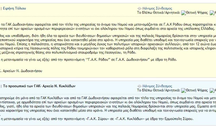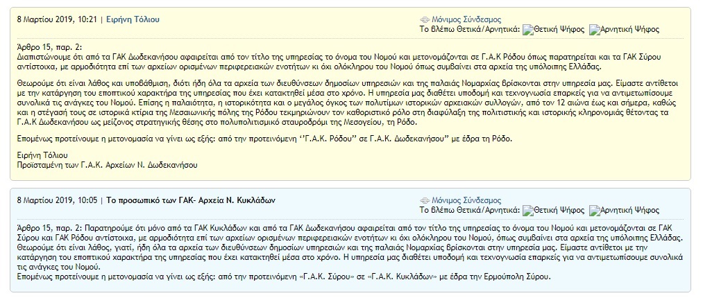 Αυτή η εξέλιξη παρατηρείται μόνον στους δύο νησιωτικούς νομούς που προαναφέρθηκαν, με τις δύο πλευρές των προϊσταμένων και των υπαλλήλων των ΓΑΚ σε Σύρο (Κυκλάδες) και Ρόδο (Δωδεκάνησα) να έχουν ήδη προβεί σε παρέμβαση εντός του χρόνου της διαβούλευσης.