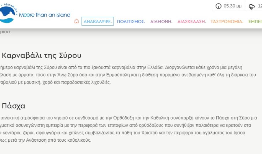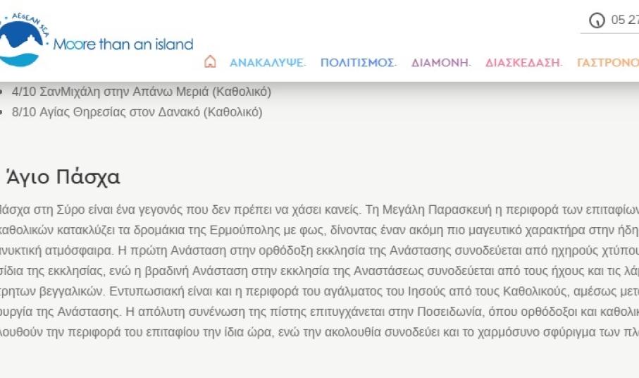 Αν και η ίδια η Δημοτική Αρχή έχει πολλάκις κάνει λόγο για αξιοποίηση των σύγχρονων εργαλείων που προσφέρει το διαδίκτυο, ωστόσο, η ίδια επιδεικνύει προκλητική αδιαφορία ακόμη και για τα δικά της ακριβοπληρωμένα μέσα, όπως το τουριστικό portal (syrosisland), στο οποίο οι δύο αναφορές που υπάρχουν για το Πάσχα στη Σύρο, χαρακτηρίζονται από προχειρότητα στη σύνταξη και το περιεχόμενο, ενώ μάλιστα δεν ταυτίζονται.