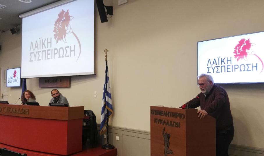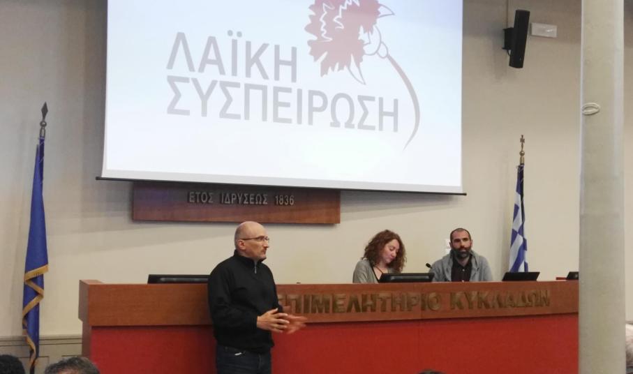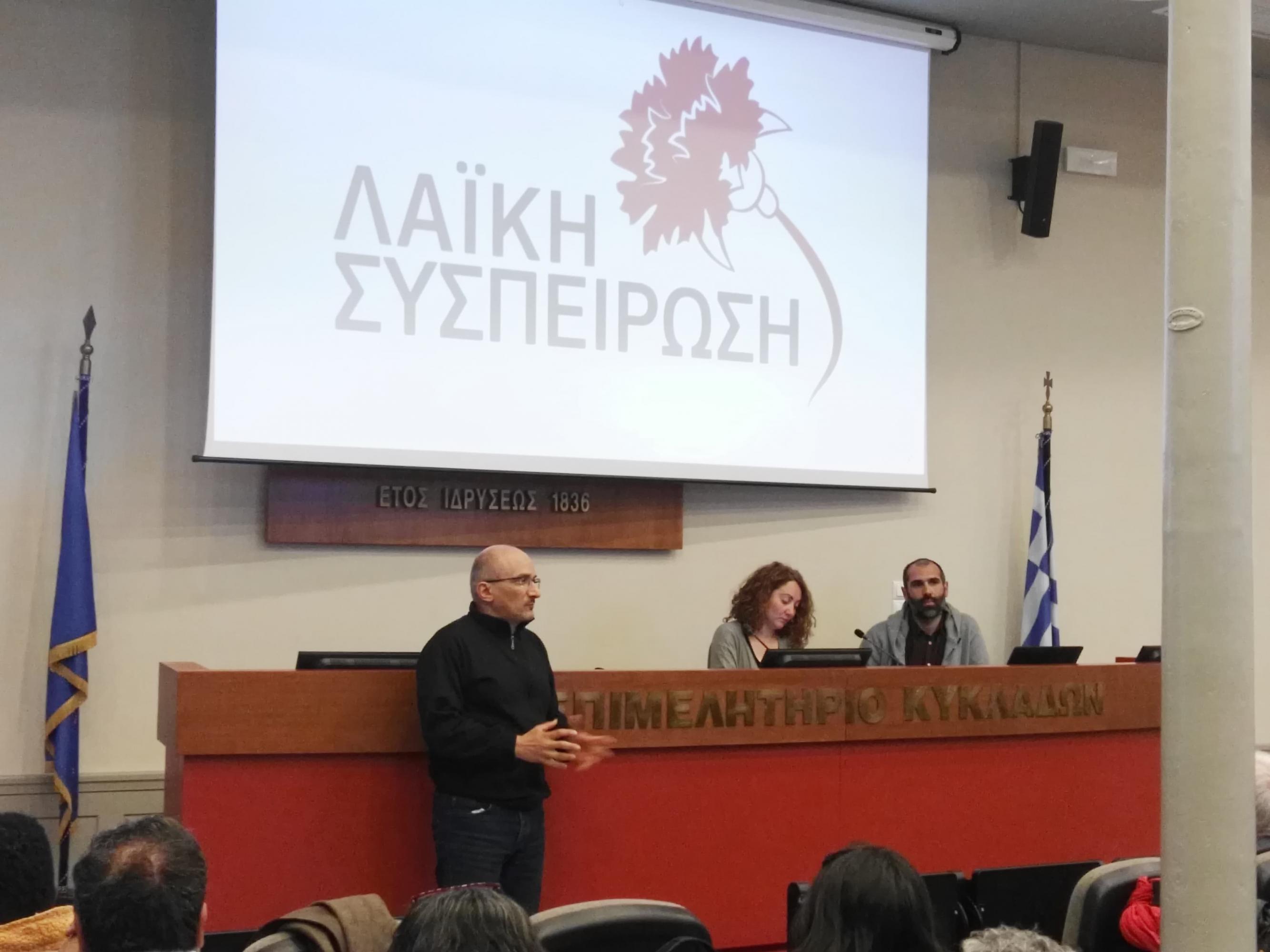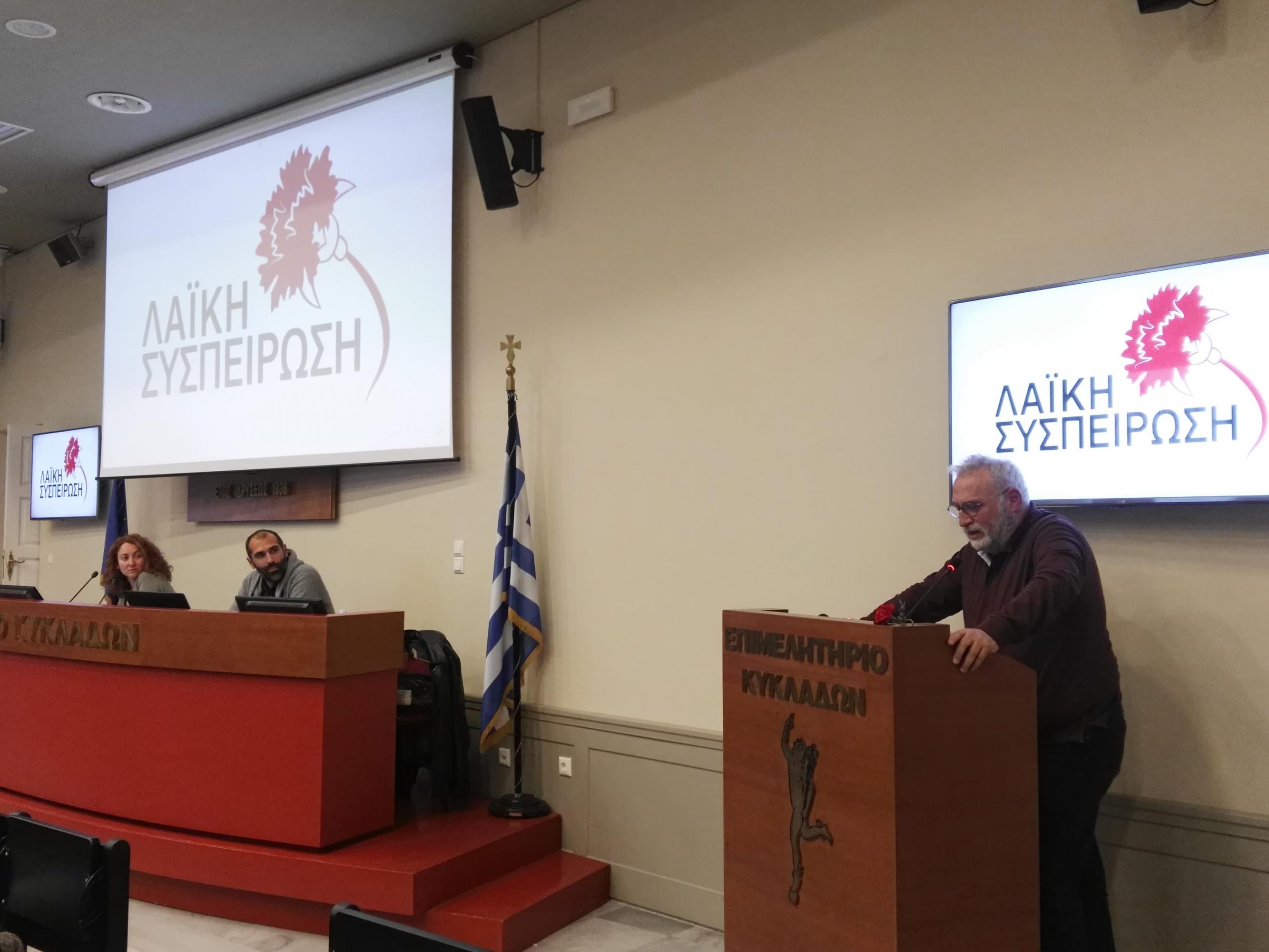 Από το Επιμελητήριο Κυκλάδων και παρουσία πολλών μελών, φίλων και συνεργαζόμενων της Λαϊκής Συσπείρωσης για τον Δήμο Σύρου – Ερμούπολης, ο κ. Καΐλης απηύθυνε αγωνιστικό κάλεσμα συμπόρευσης προς κάθε δημότη, στην κατεύθυνση – όπως χαρακτηριστικά ανέφερε – πως “προοδευτικό” για τον συνδυασμό του, βαφτίζεται “ο ρεαλισμός των αναγκών των πολλών”.