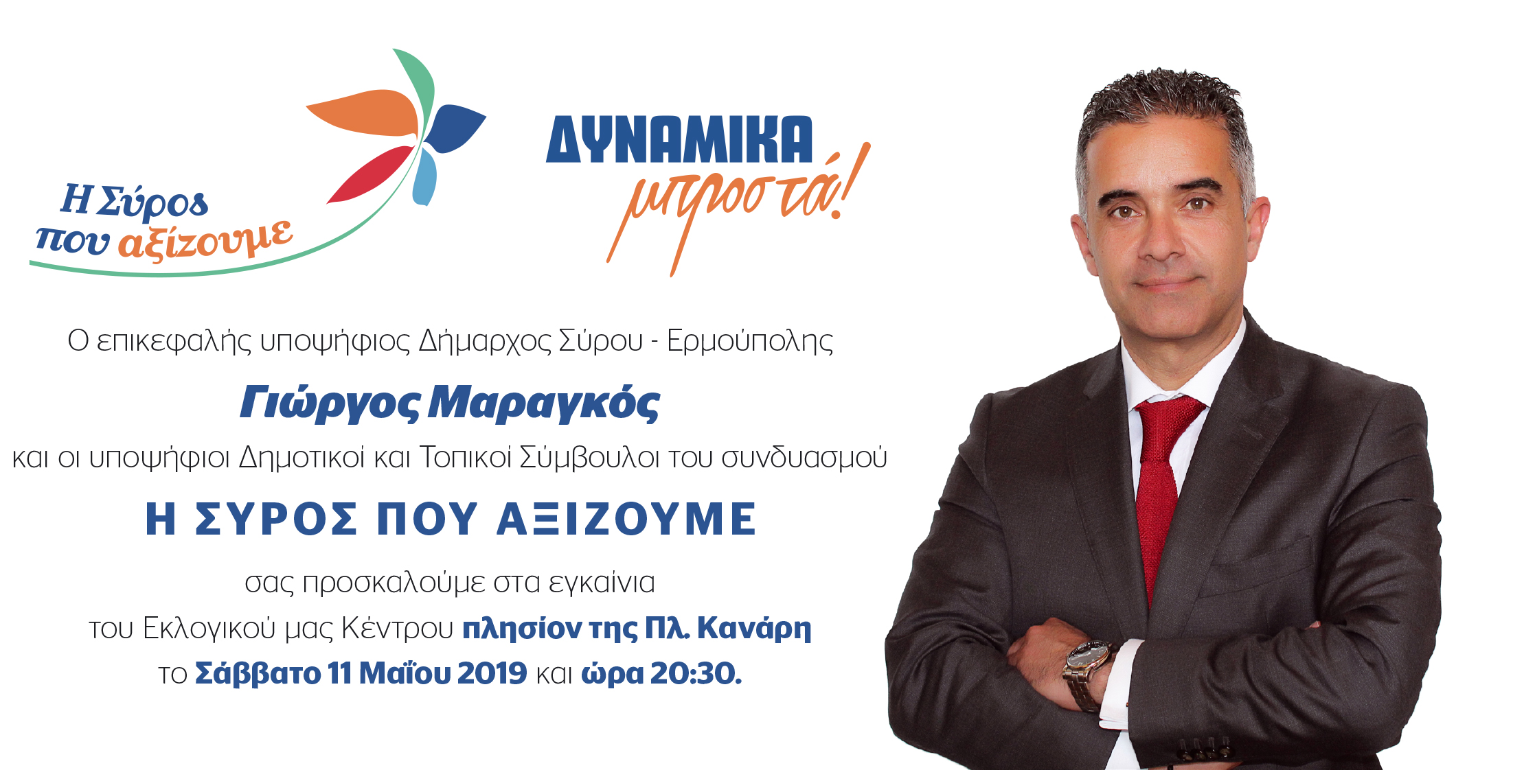 Σας προσκαλούμε στα εγκαίνια του εκλογικού κέντρου του συνδυασμού μας "Η Σύρος που αξίζουμε" στον πεζόδρομο της οδού Θυμάτων Σπερχειού, το Σάββατο 11 Μαΐου 2019 και ώρα 20:30.