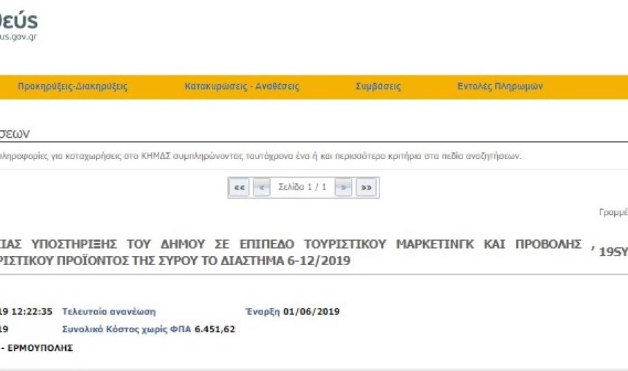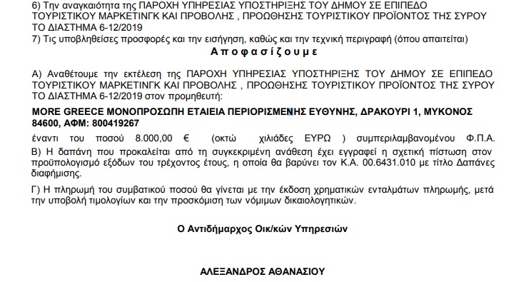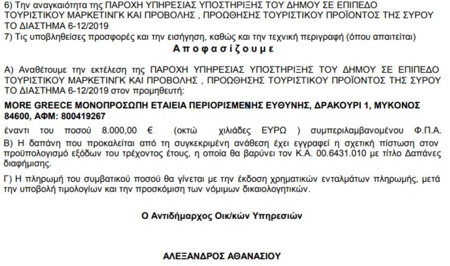 Συγκεκριμένα, η απόφαση που υπογράφει ο Αλέξης Αθανασίου αναφέρει τα παρακάτω: “Αποφασίζουμε: Α. Αναθέτουμε την εκτέλεση της ΠΑΡΟΧΗ ΥΠΗΡΕΣΙΑΣ ΥΠΟΣΤΗΡΙΞΗΣ ΤΟΥ ΔΗΜΟΥ ΣΕ ΕΠΙΠΕΔΟ ΤΟΥΡΙΣΤΙΚΟΥ ΜΑΡΚΕΤΙΝΓΚ ΚΑΙ ΠΡΟΒΟΛΗΣ, ΠΡΟΩΘΗΣΗς ΤΟΥΡΙΣΤΙΚΟΥ ΠΡΟΪΟΝΤΟΣ ΤΗΣ ΣΥΡΟΥ ΤΟ ΔΙΑΣΤΗΜΑ 6 – 12/2019 ΣΤΟΝ ΠΡΟΜΗΘΕΥΤΗ: MORE GREECE ΜΟΝΟΠΡΟΣΩΠΗ ΕΤΑΙΡΕΙΑ ΠΕΡΙΟΡΙΣΜΕΝΗΣ ΕΥΘΥΝΗΣ, ΔΡΑΚΟΥΡΙ 1, ΜΥΚΟΝΟΣ 84600 (...) έναντι του ποσού 8.000 ευρώ συμπεριλαμβανομένου ΦΠΑ. (...)”.