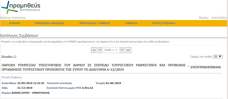 Παρομοίως και στο σύστημα “Προμηθεύς”, με μία αναζήτηση με το ΑΦΜ της εν λόγω εταιρείας, αποδεικνύεται πως η παροχή της υπηρεσίας υποστήριξης του Δήμου σε επίπεδο τουριστικού marketing έγινε στην More Greece, με ποσό 8.000 ευρώ για το εξάμηνο Ιουνίου – Δεκεμβρίου του τρέχοντος έτους.